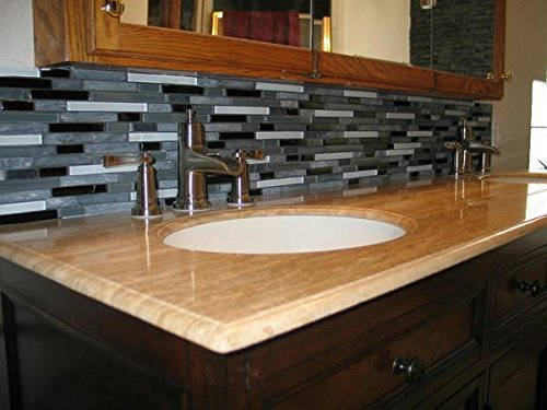 A well balanced blend of black, gray and white glass interlaced with a nice mix of gray stone mosaic strips. A great choice for a kitchen or bathroom in need of a nice cool neutral tile.