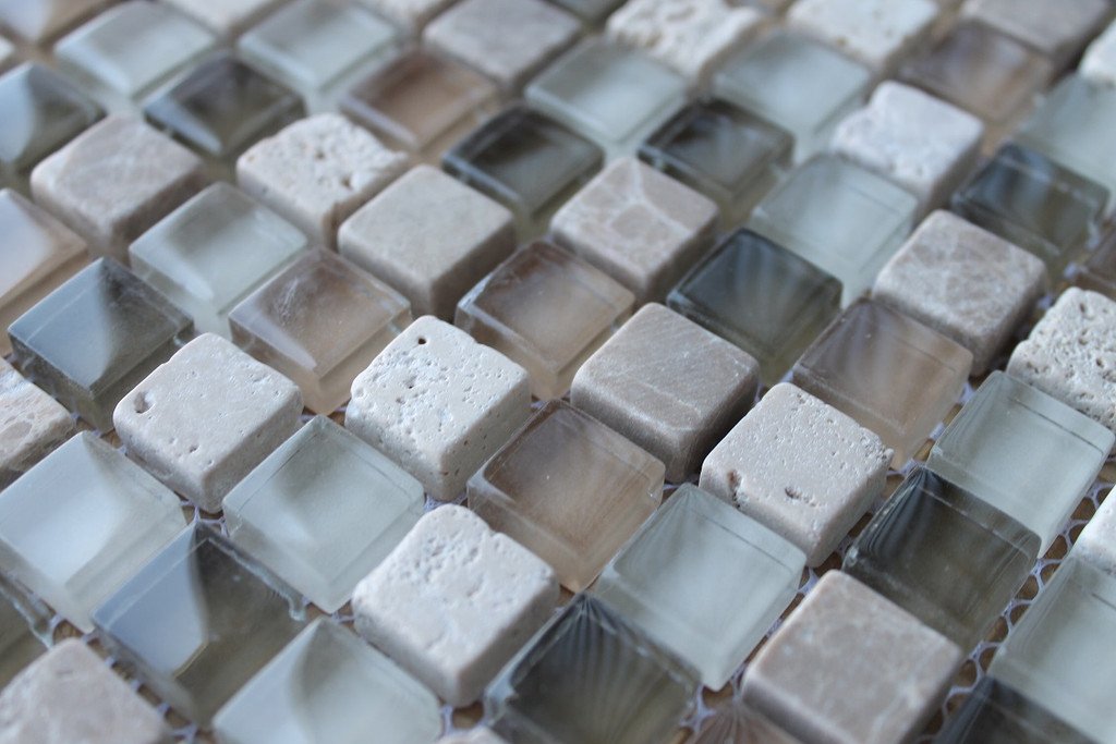 A nice neutral mix of browns, white and cream colors come together in this delightful blend of glass and stone 5/8 x 5/8 square mosaics.