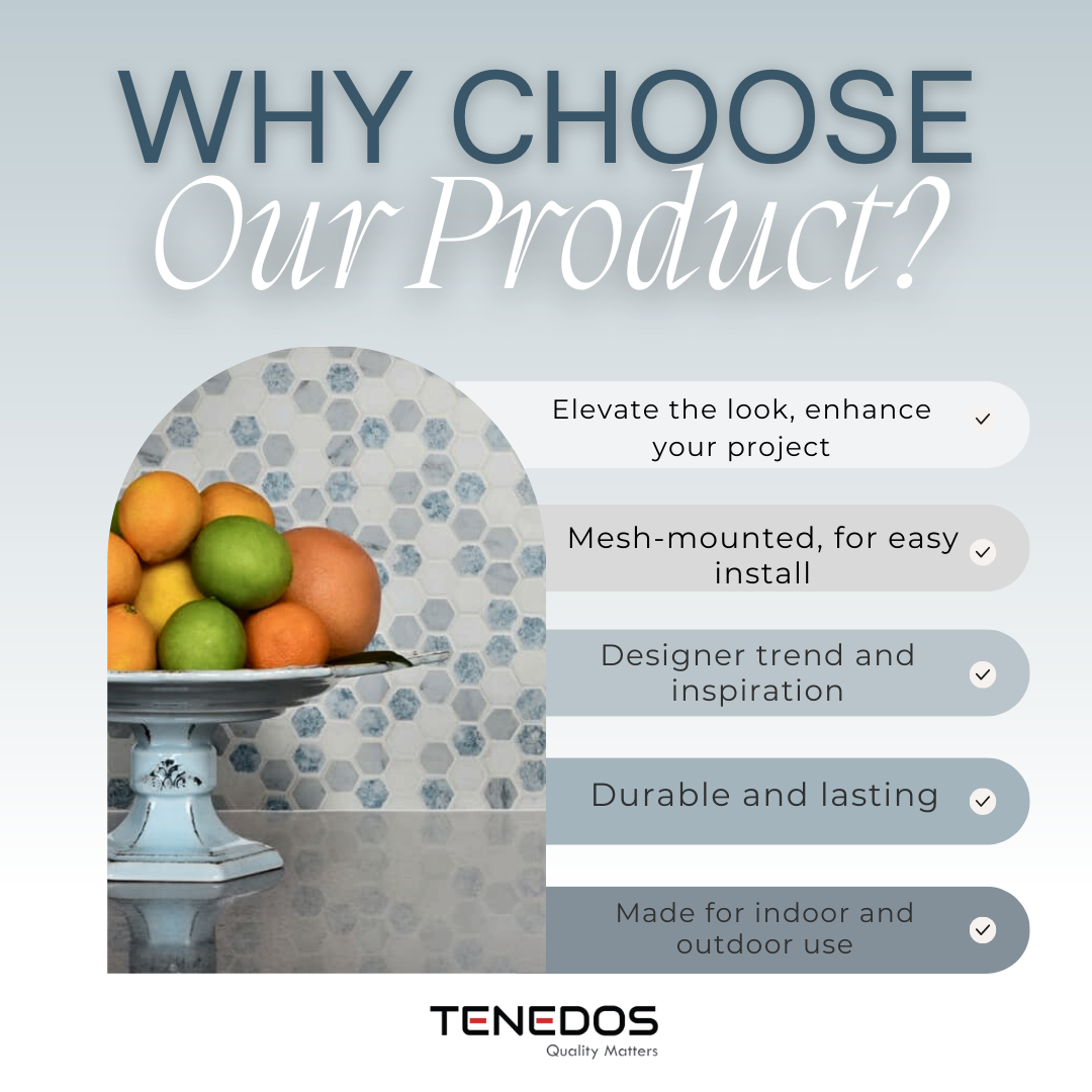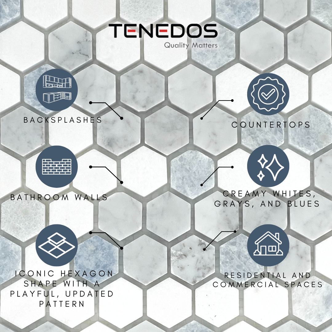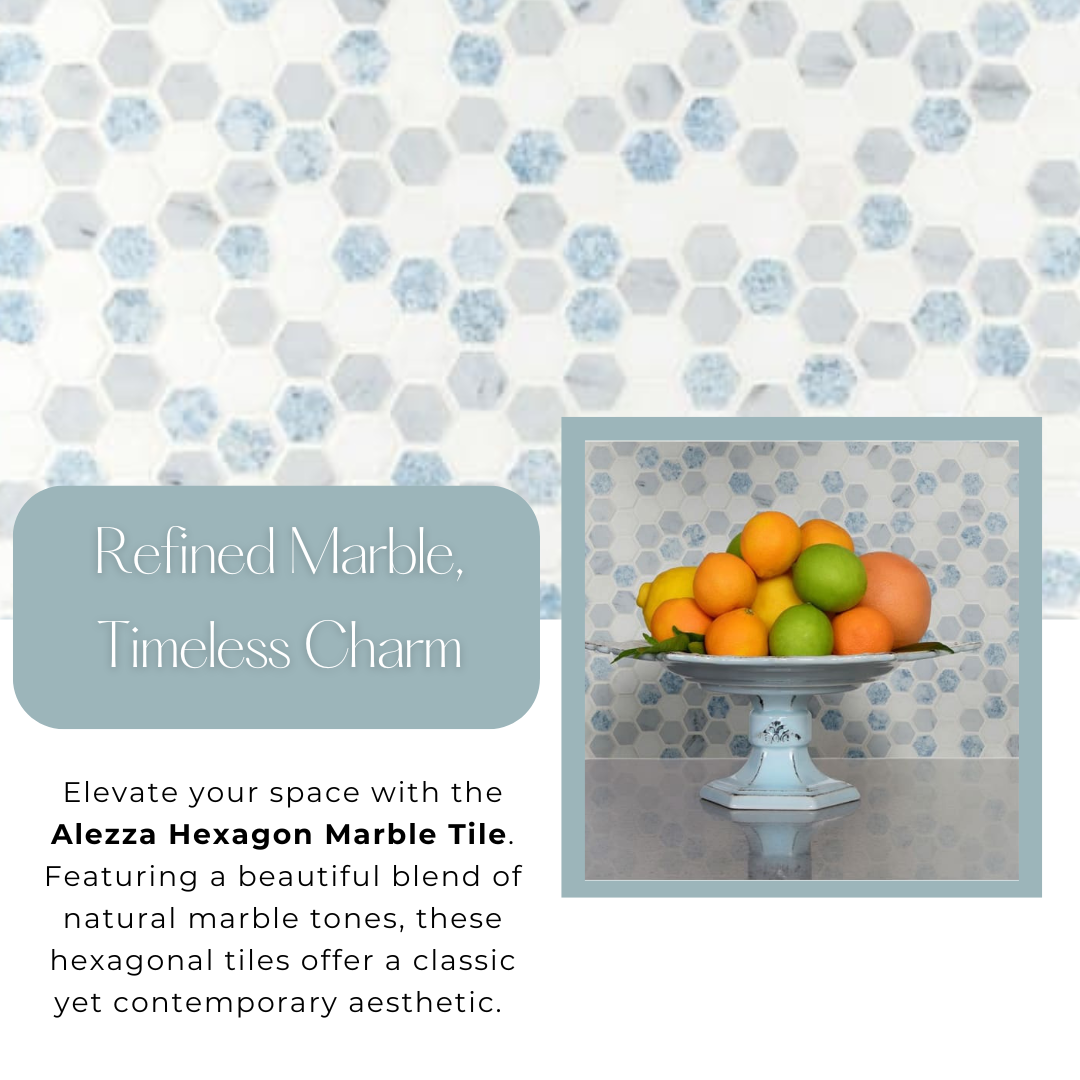 Alezza Hexagon tile showcases a distinctive shape in a refreshed, playful design featuring 1-inch hexagons crafted from luxurious marble. The soft tones of whites, grays, and blues make a subtle yet striking statement. It is compatible with subsurface heating systems and is semi-vitreous, offering versatile installation options for floors and walls in spaces like bathrooms, kitchens, hallways, and walk-in closets. Its frost-resistant properties make it suitable for outdoor use, and it boasts excellent skid resistance to ensure stable footing. This Polished Marble Mesh-Mounted Mosaic Tile is ideal for both residential and commercial settings, delivering an elegant, yet affordable finish. Note: Always inspect tiles before installation. Due to the natural variation in stone, expect differences in color, shade, and texture. It's advisable to mix tiles from various boxes during installation. Natural stone may feature dry seams or pits that are often filled, which may require refilling as part of routine maintenance. All natural stone products should be treated with a penetrating sealer.