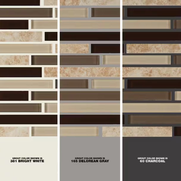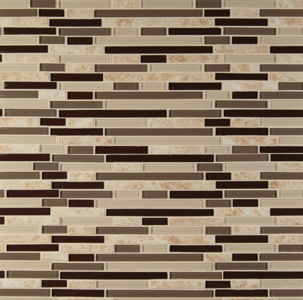 The MSI Amalfi Cafe Interlocking Glass and Porcelain Mesh-Mounted Mosaic Tile combines warm beige, deep brown, and creamy neutral tones in a sleek staggered linear pattern, offering a modern yet inviting aesthetic. The contrast between glossy glass and matte porcelain adds depth and dimension, making it an ideal choice for backsplashes, feature walls, and accent areas.