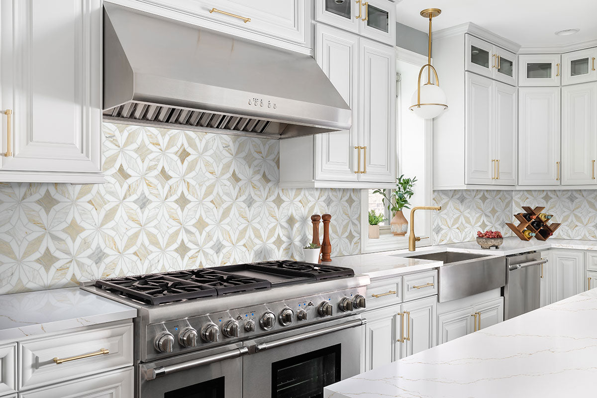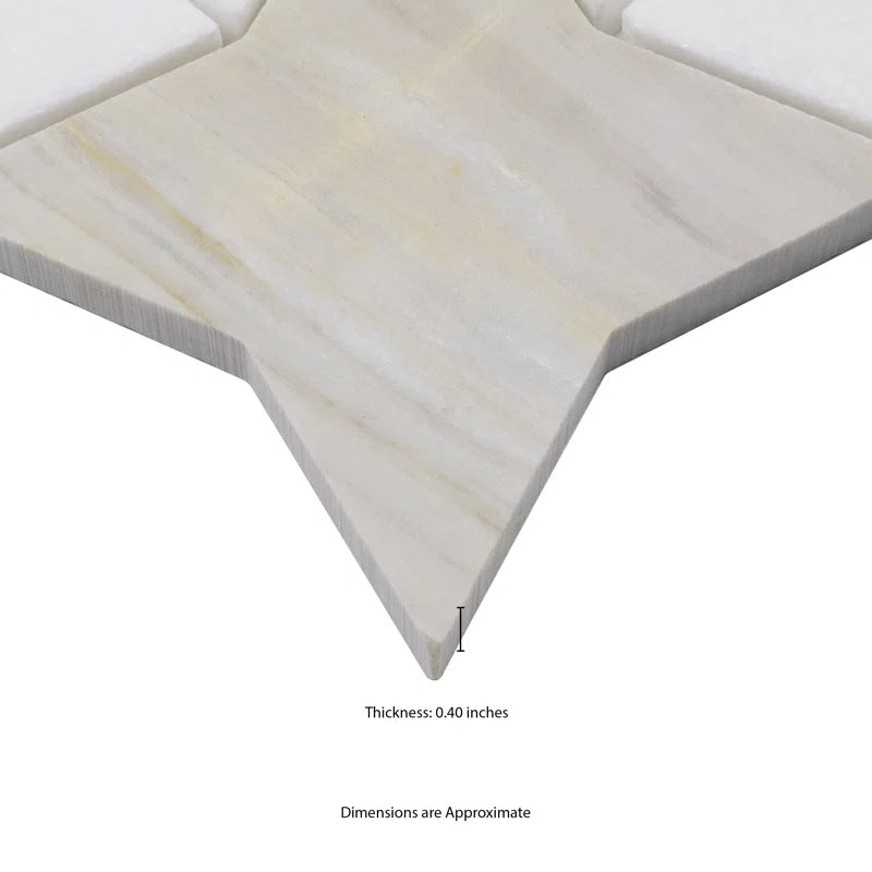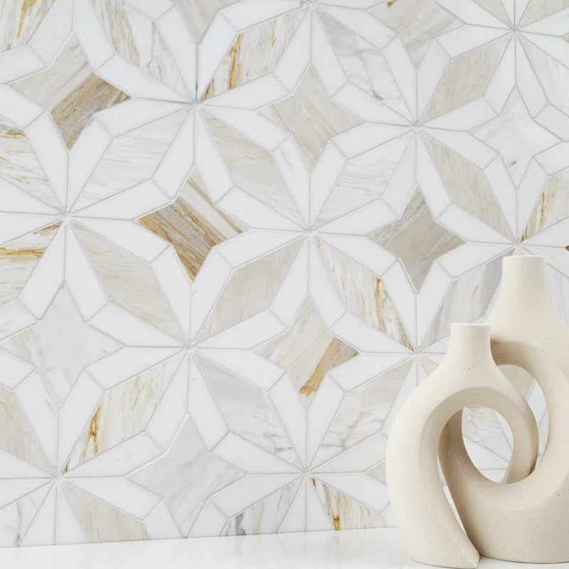 Athena Gold Estrella polished mosaic tile brings a captivating blend of geometric star shapes in warm white and soft gray hues, enhanced by delicate veining throughout. Crafted from luxurious marble, it offers both beauty and durability, while the convenient mesh backing ensures easy installation. Perfect for kitchen backsplashes, bathroom or shower walls, and even residential floors, this tile adds an elegant and modern touch to any space.