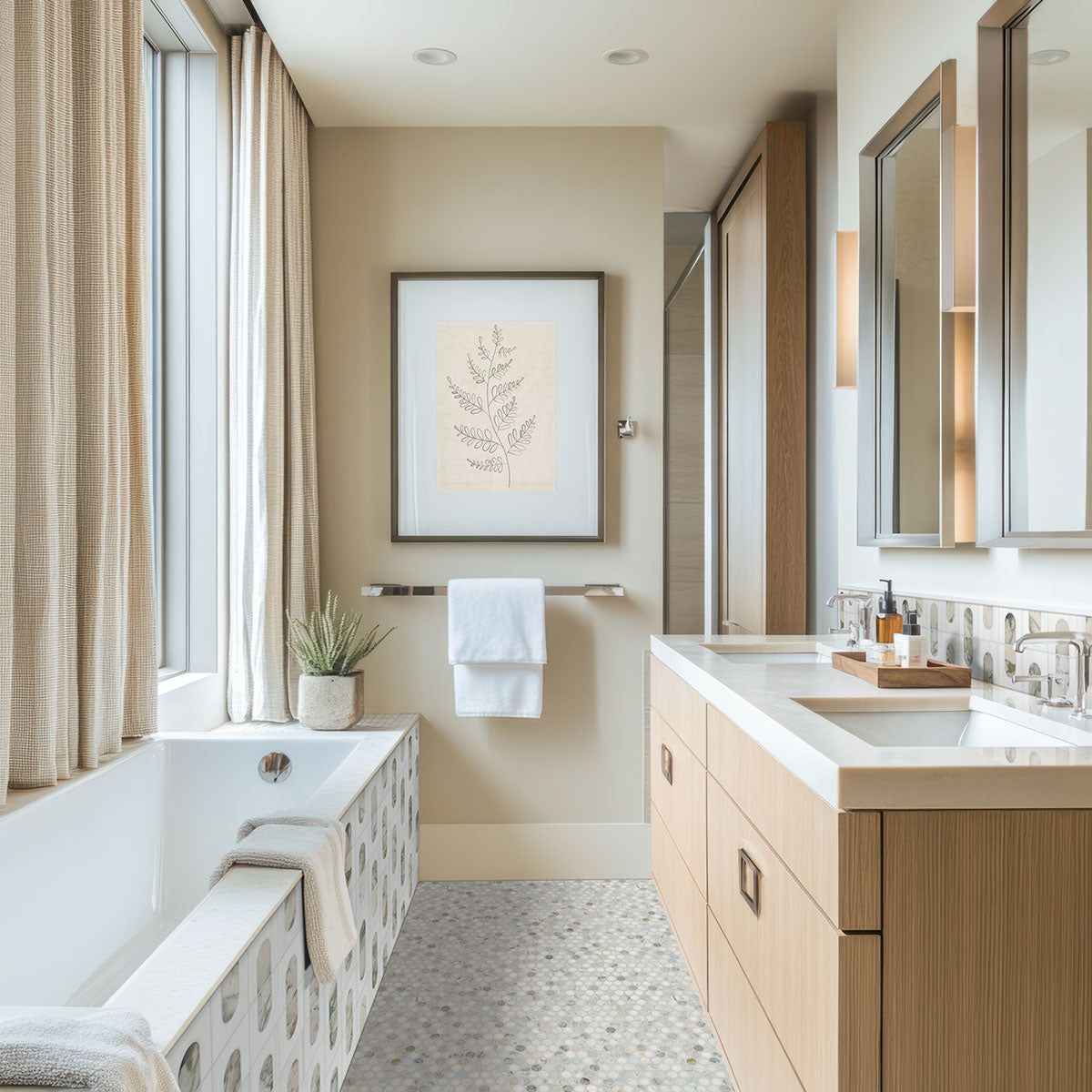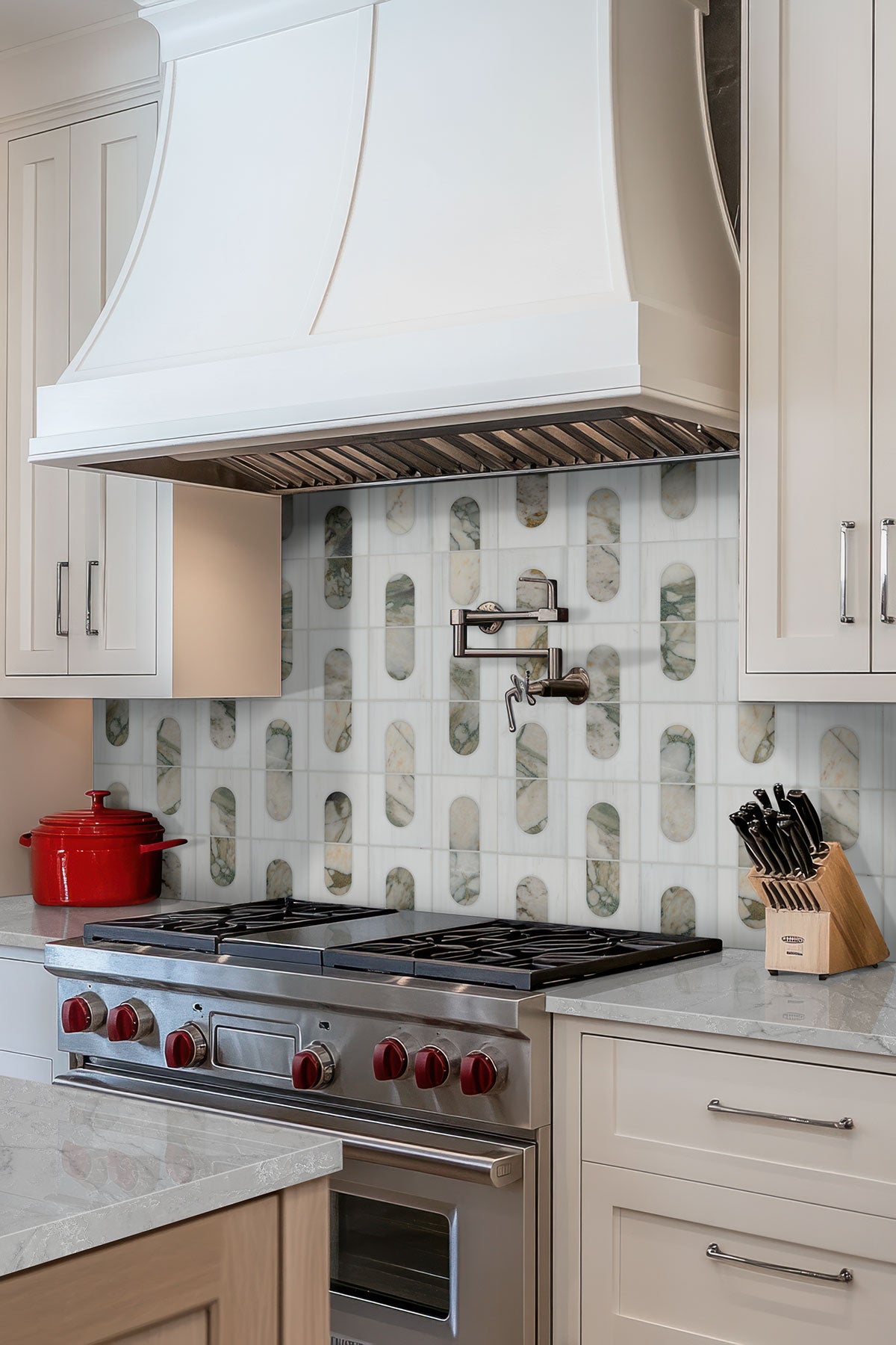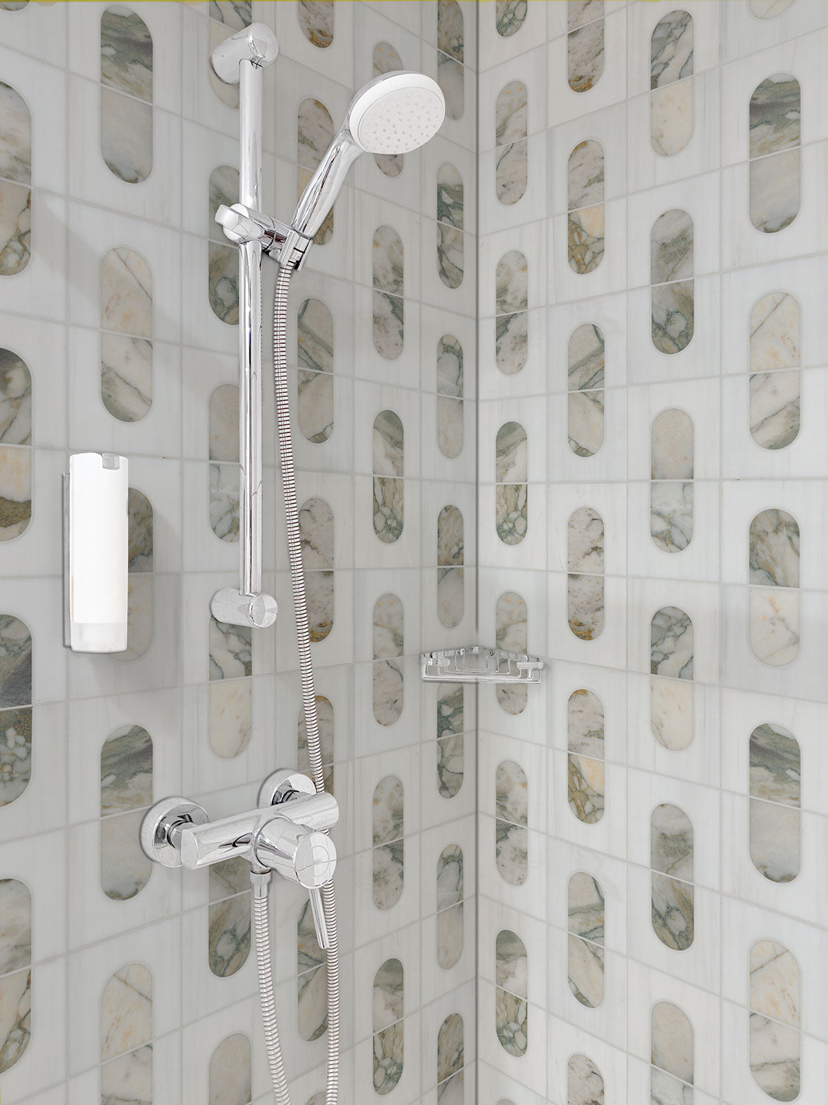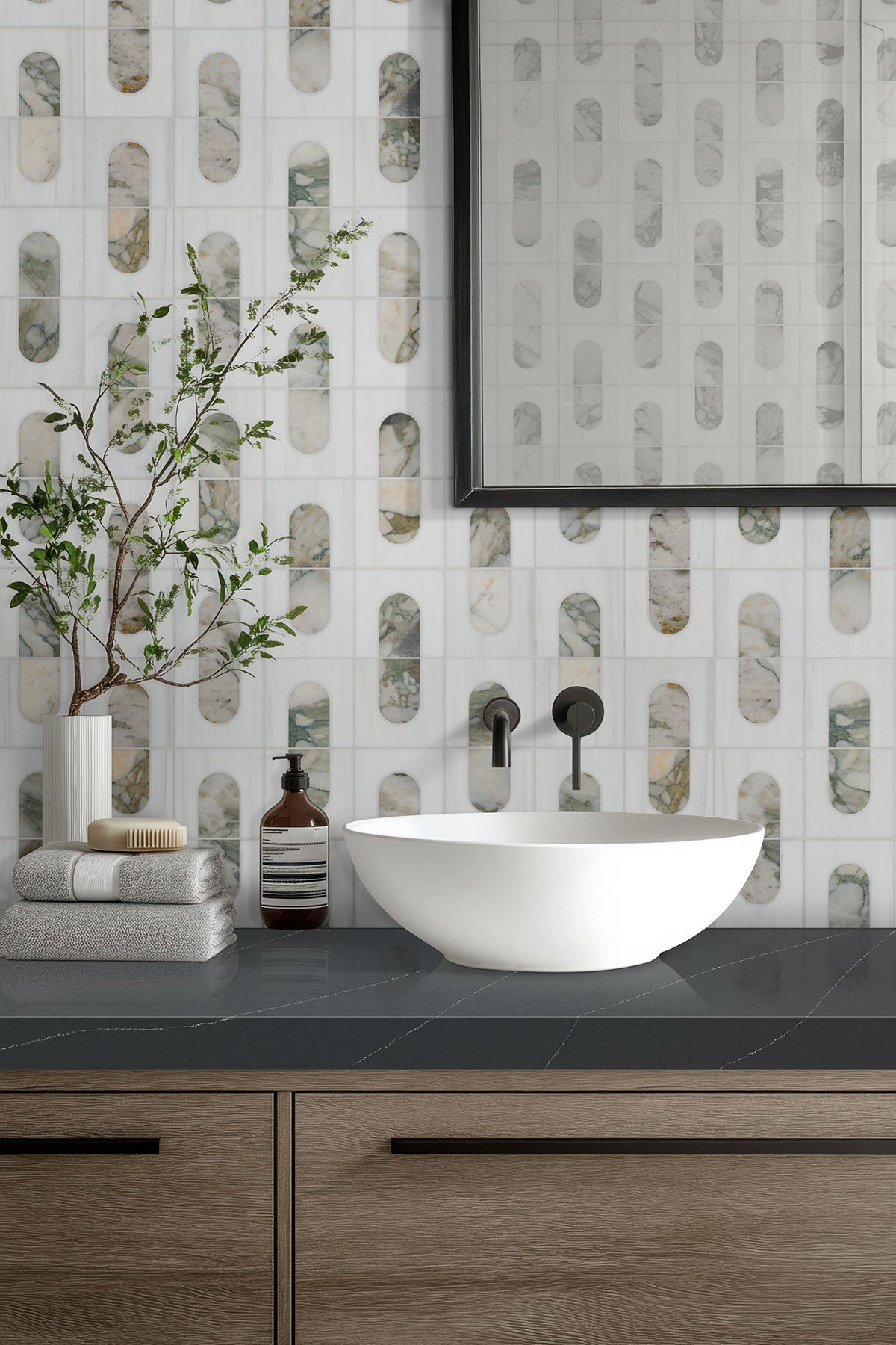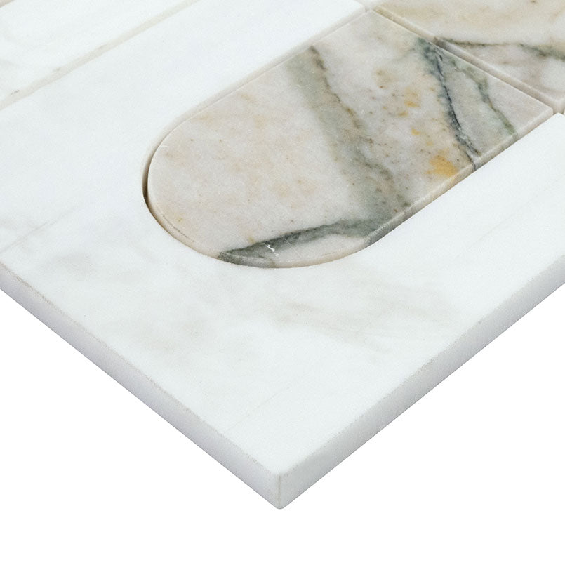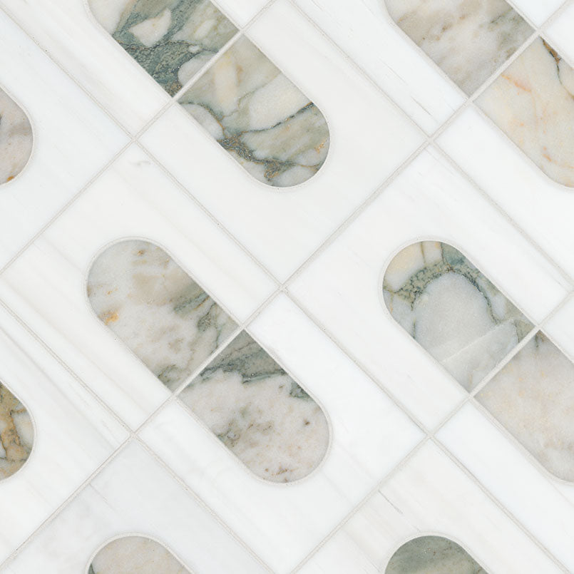 Bianco Dolomite Moderno features a polished white marble background beautifully accented by a unique geometric pattern, showcasing striking gray and copper veined marble for a distinctive and eye-catching look. This versatile backsplash tile is ideal for enhancing bathrooms, kitchens, laundry rooms, and other spaces, effortlessly blending elegance with contemporary design. Elevate your interiors with this sophisticated tile that adds a touch of luxury and individuality to any environment.