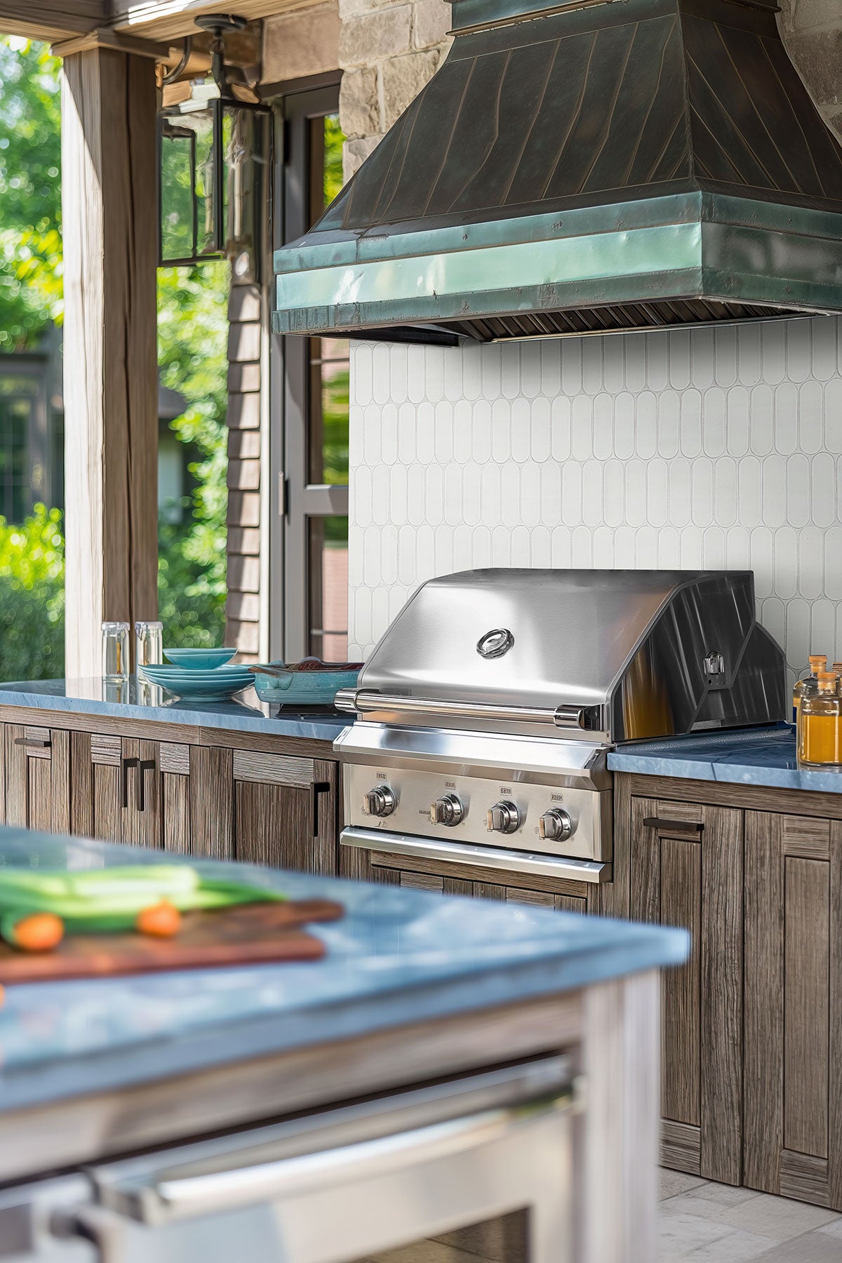 Bianco Glossy Ellipse recycled glass tile, showcasing an elongated scallop design in cool white with a polished finish, adds a touch of sophistication to any space. The mosaic's mesh-back ensures effortless installation, making it ideal for backsplashes, feature walls and even countertops in kitchens, bathrooms, and beyond. Perfect for both residential and commercial applications, this versatile tile brings a crisp, clean look and a touch of elegance to any setting.