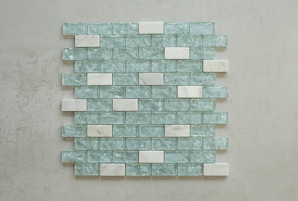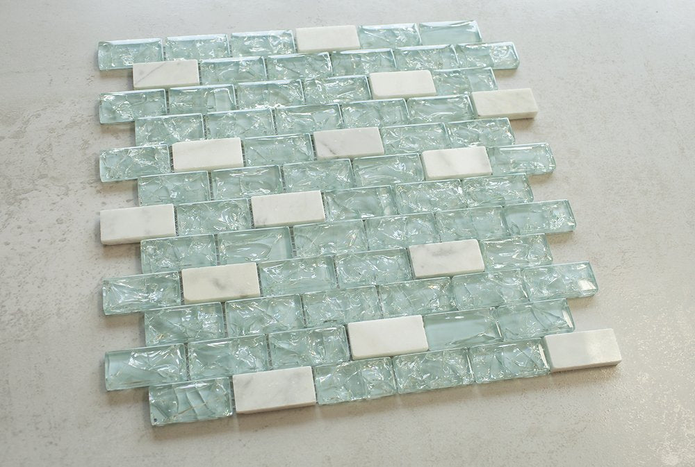 Blue Cleft Glass & Bianco Marble Mosaic Tile - Blue & White 1"x2" Glass Tile for Kitchen Backsplash bathroom Wall