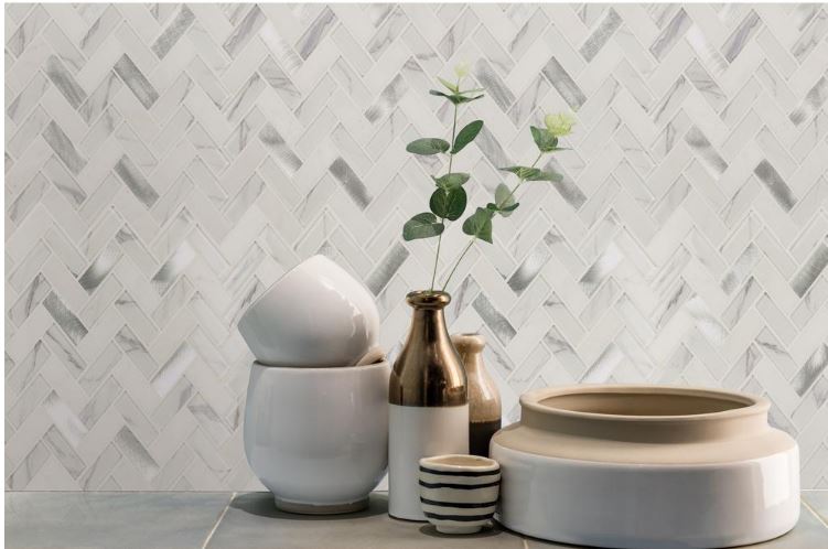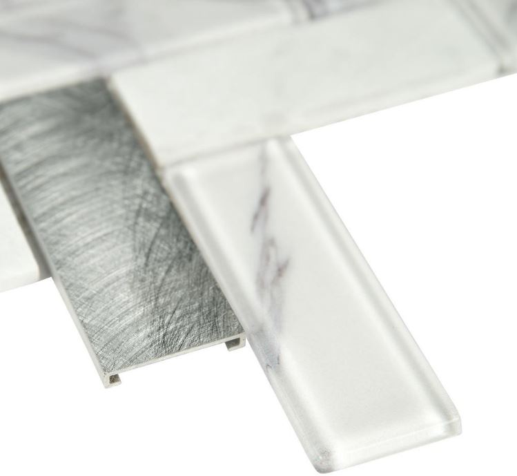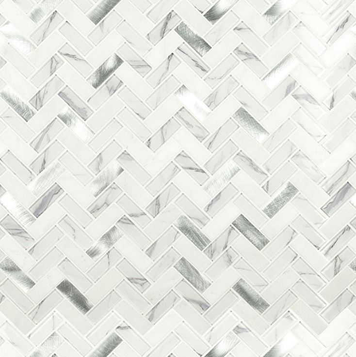 Enhance your home's walls or countertops with this Bytle Bianco Herringbone Glass metal and stone mesh-mounted mosaic wall tile. Crafted from an unglazed finish with a high/low sheen, these wall tiles feature subtle tone variations for character. They are perfect choice for a kitchen backsplash, bathroom shower or accent wall. The impervious tiles are arranged on a 12 in. x 12 in. mesh sheet for worry-free installation. These durable, frost-resistant wall tiles are constructed from metal and honed marble that is suitable for installation on walls.