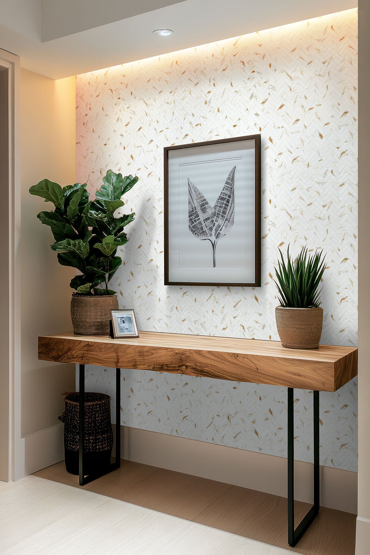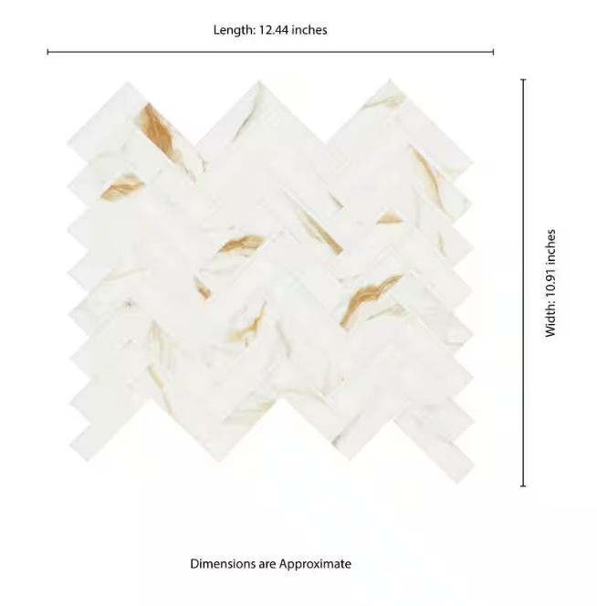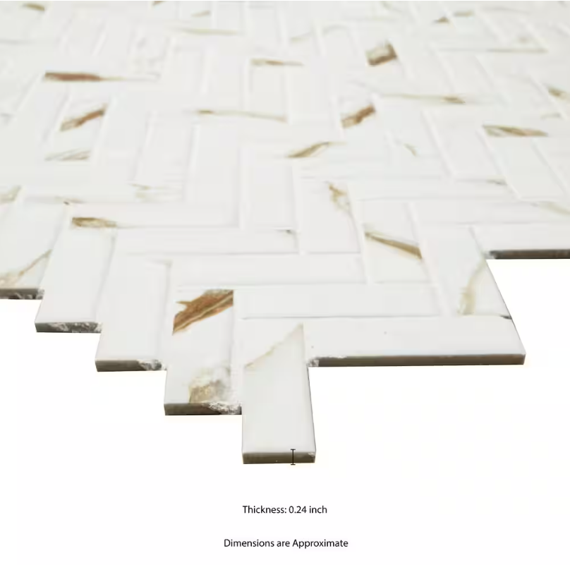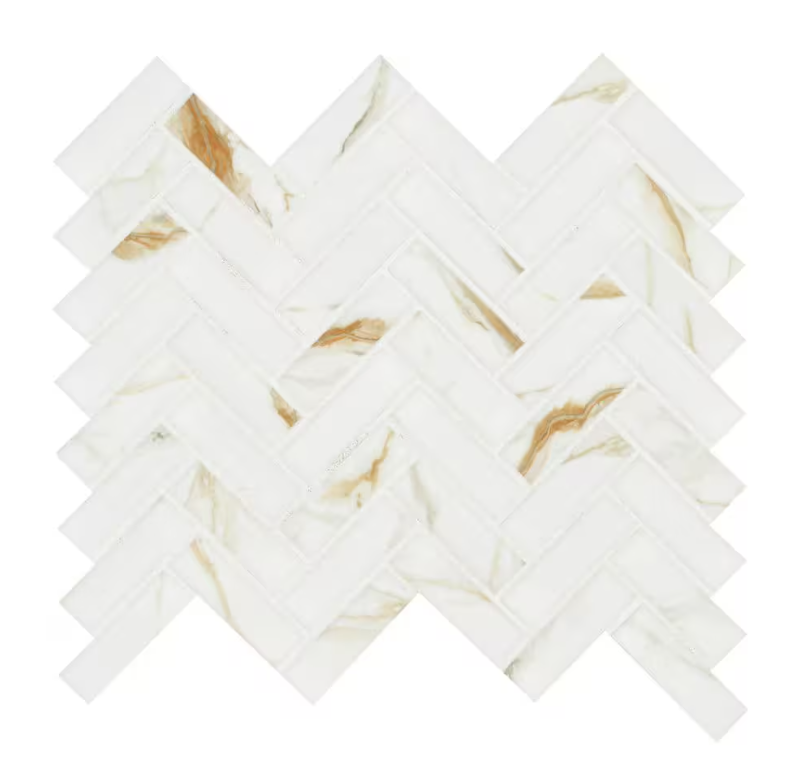 Elevate any space with the timeless beauty of Calacatta Gold Mosaic Tile in a 1” x 3” herringbone pattern. Its warm white background and graceful gold veins create a sophisticated look, complemented by a matte finish for added elegance. Designed with a mesh backing for easy installation, this tile is perfect for accent walls, backsplashes, or residential floors, offering both style and durability.
