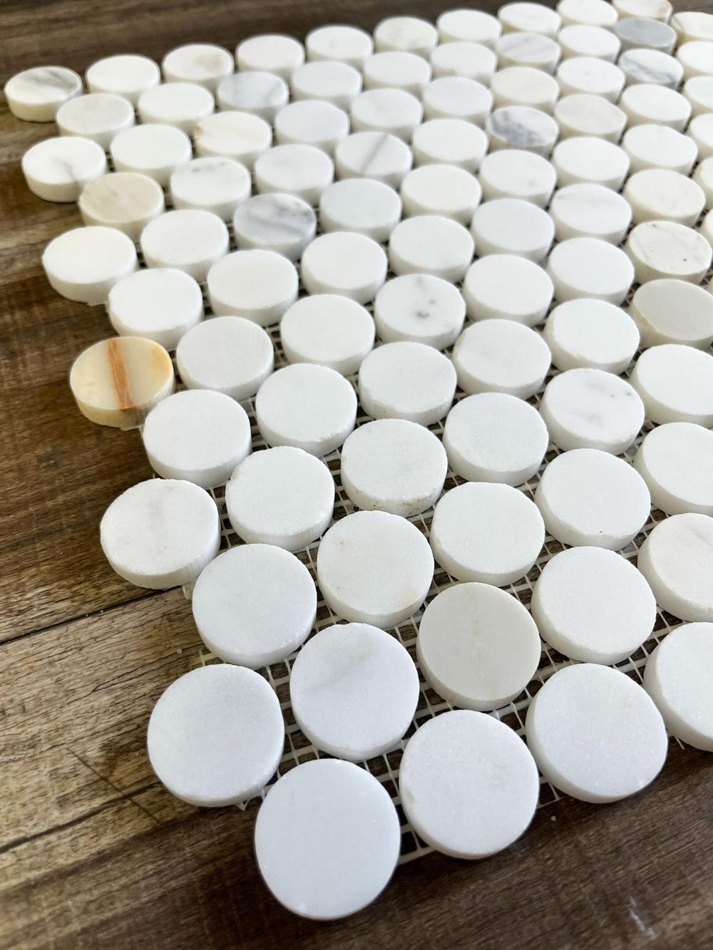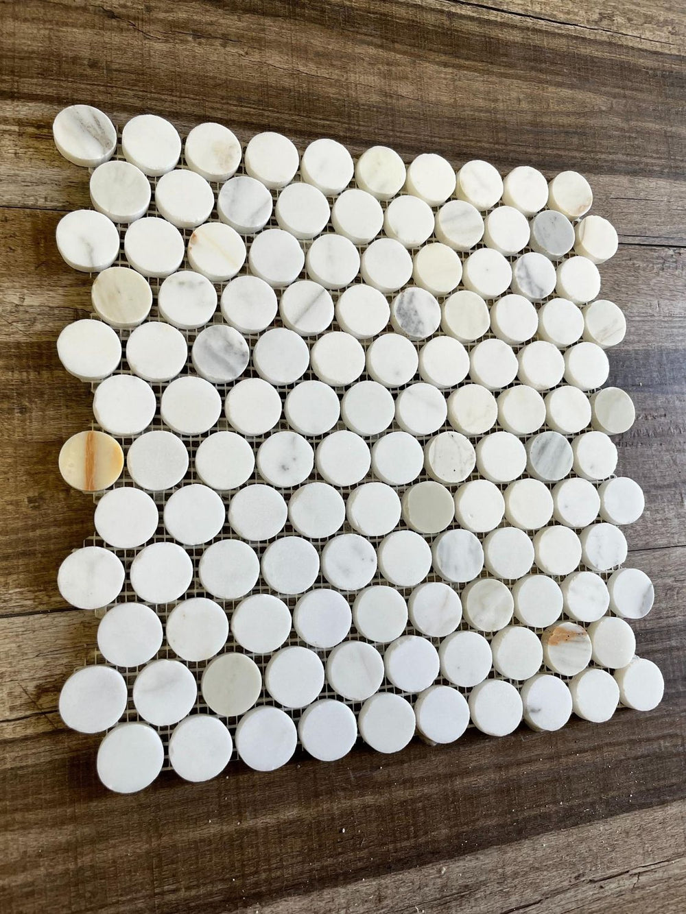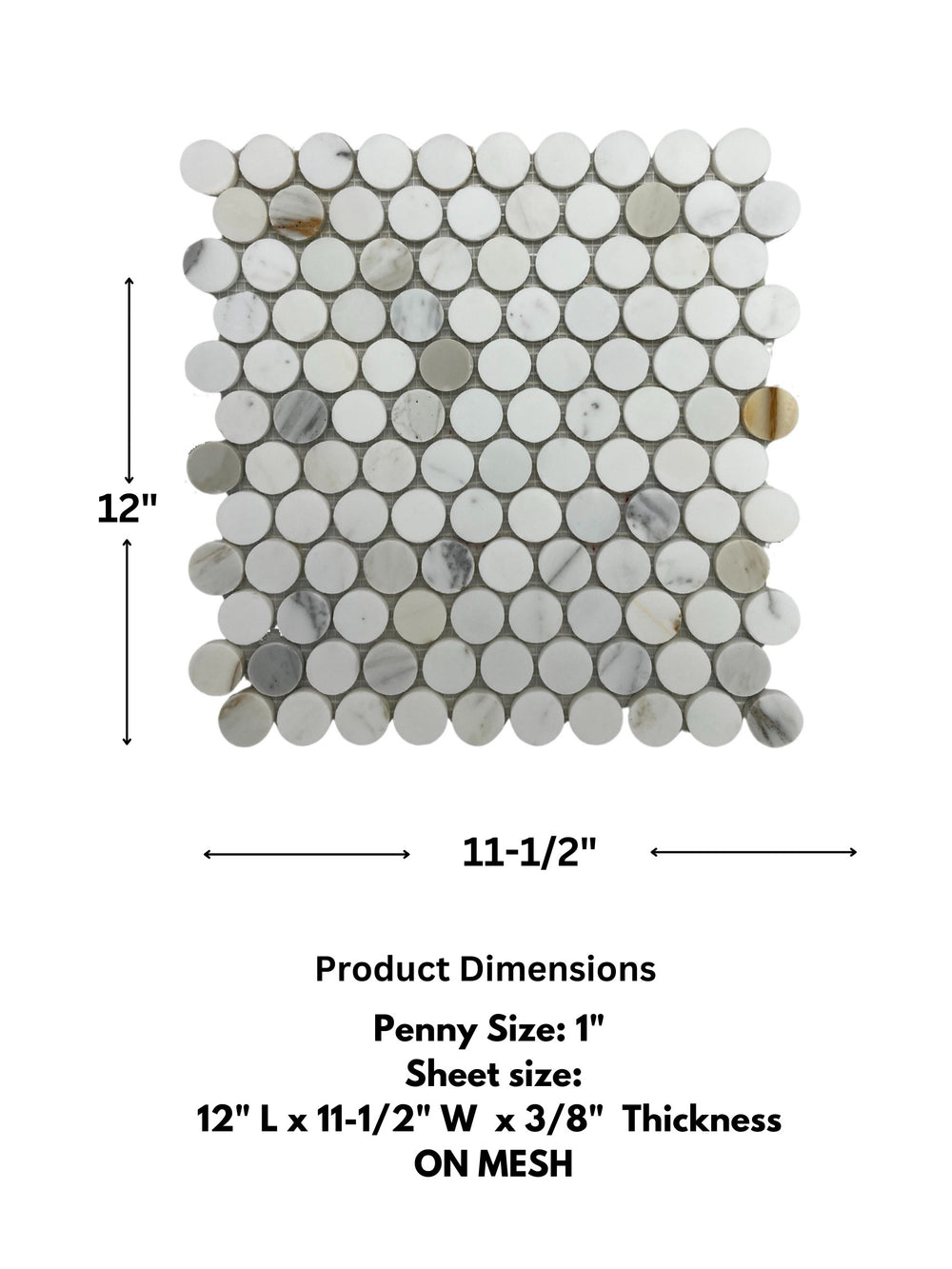 These 1-inch Calacatta Gold Penny Round Marble tiles are the perfect combination of refined beauty and durability....