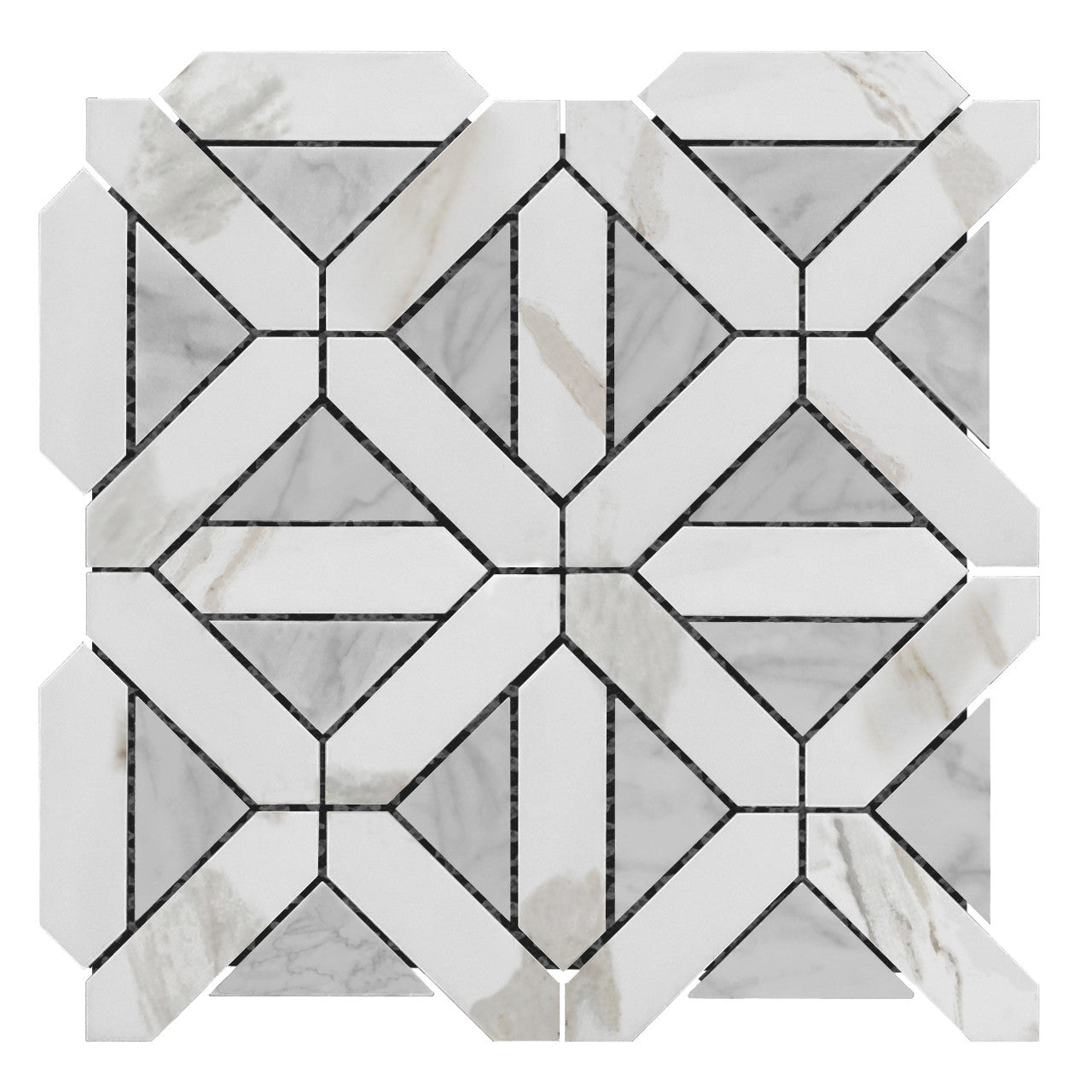 Calacatta Gold with Carrara White Geometrica Triangles Marble Mosaic Tiles are available in polished and honed finishes. Uses include kitchen backsplashes, bathroom walls, floor tiles, and shower mosaics. First-quality marble is in stock and ready to ship, with free shipping available within the continental USA. Same-day in-store pickup is also offered. Visit our showrooms for complimentary design ideas. Geometrica mosaics are perfect for both residential and commercial projects and are mainly preferred as floor tiles for their clean and aesthetic qualities. A large selection of coordinating products is available, including Calacatta Gold basketweave mosaics, Calacatta Gold herringbone mosaics, Calacatta Gold hexagon mosaics, 4x12 marble subway tiles, 12x12 Calacatta Gold marble tiles, 4x4 Calacatta Gold marble tiles, Calacatta Gold borders, Calacatta Gold moldings, and Calacatta Gold baseboards.