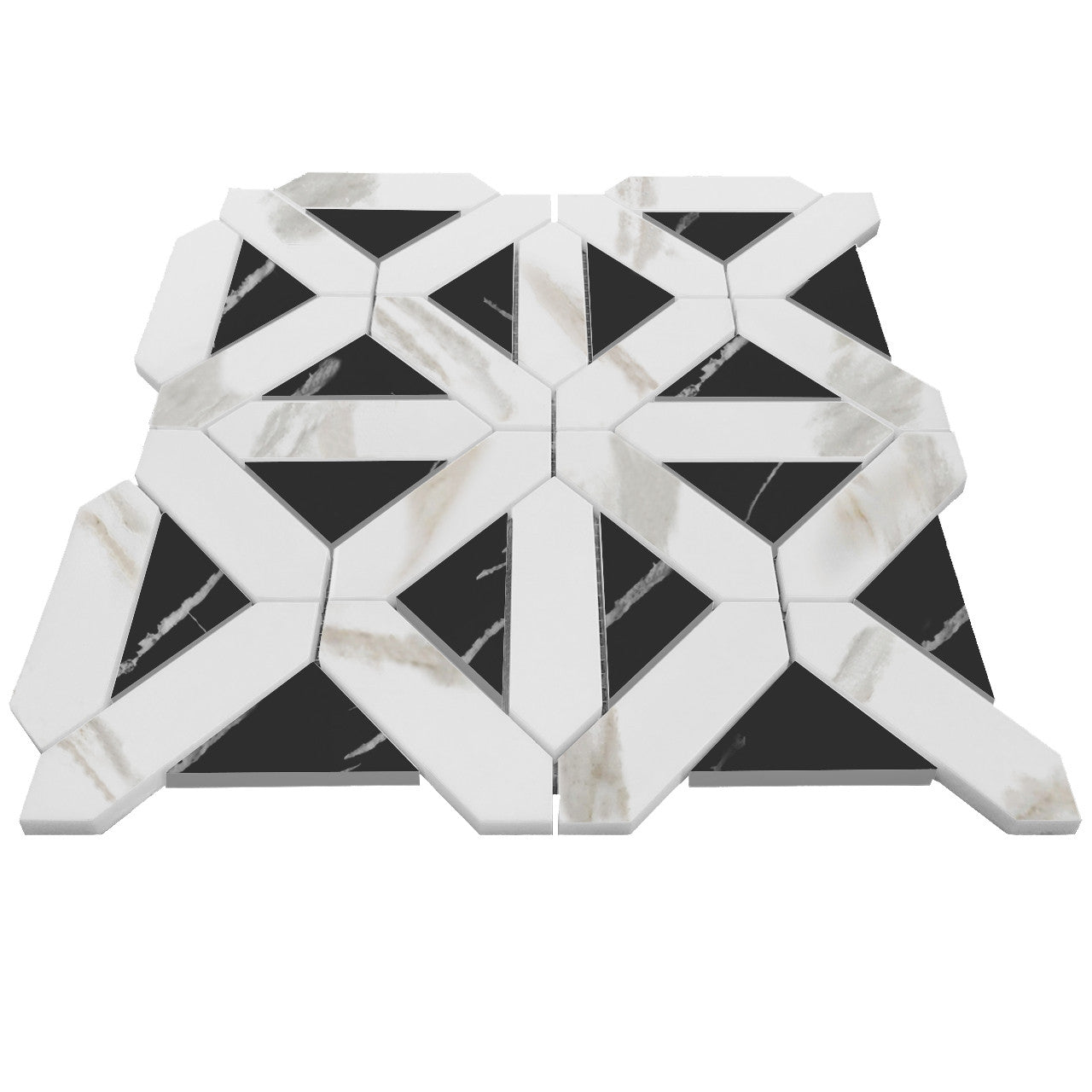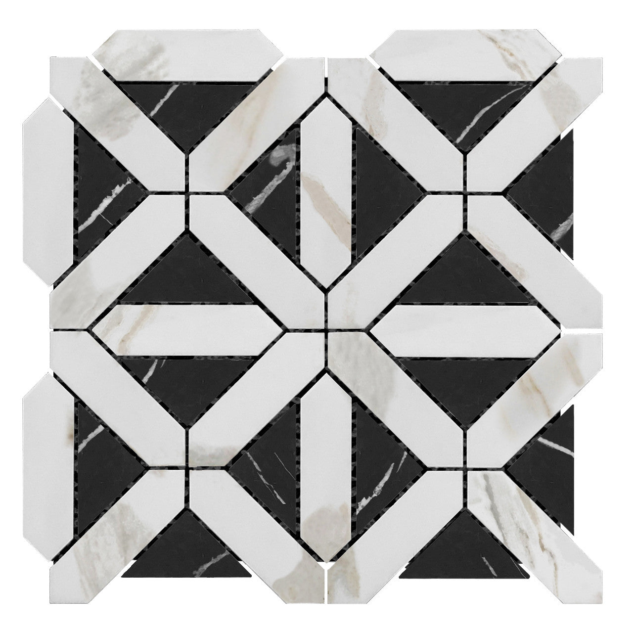 Calacatta Gold with Nero Marquina Black Geometrica Triangles Marble Mosaic Tiles are available in polished and honed finishes. Uses include kitchen backsplashes, bathroom walls, floor tiles, and shower mosaics. First-quality marble is in stock and ready to ship, with free shipping available within the continental USA. Same-day in-store pickup is also offered. Visit our showrooms for complimentary design ideas. Geometrica mosaics are perfect for both residential and commercial projects and are especially preferred as floor tiles for their clean and aesthetic qualities. A large selection of coordinating products is available, including Calacatta Gold basketweave mosaics, Calacatta Gold herringbone mosaics, Calacatta Gold hexagon mosaics, 3x6 marble subway tiles, 12x12 Calacatta Gold marble tiles, 4x4 Calacatta Gold marble tiles, Calacatta Gold borders, Calacatta Gold moldings, and Calacatta Gold baseboards.
