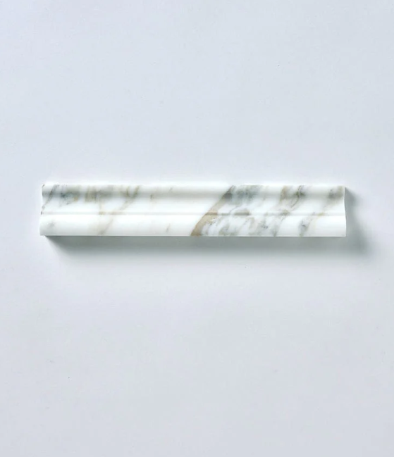 Elevate your design with the luxurious elegance of Calacatta Gold Marble Crown Molding Trim. Featuring the signature white marble base adorned with delicate golden veining, this trim adds a refined finishing touch to walls, ceilings, and other tiled spaces. The crown molding profile enhances architectural details, creating a seamless transition between surfaces while imparting a sense of sophistication. Ideal for both residential and commercial projects, this versatile trim is perfect for framing backsplashes, accentuating feature walls, or adding a decorative edge to tiled installations. Available in a polished or honed finish, it complements a variety of design styles, from classic to modern.
