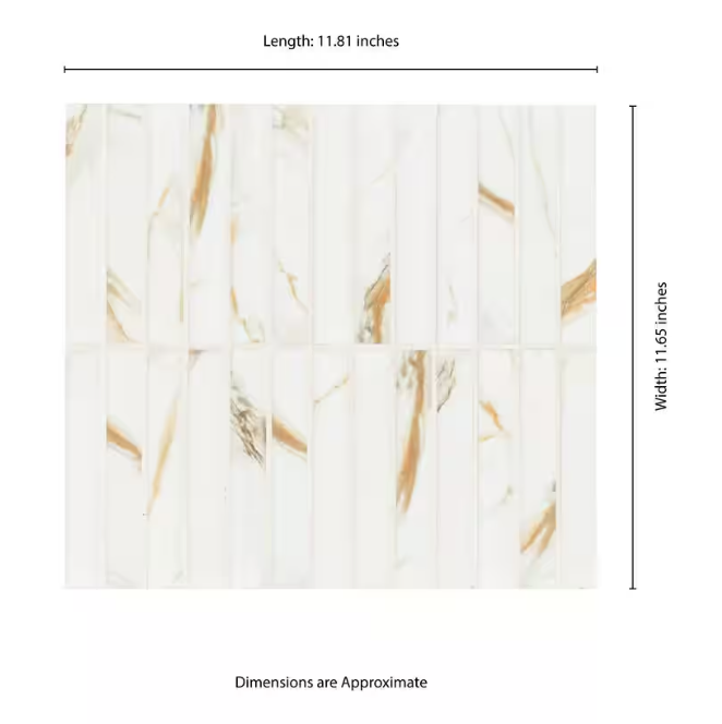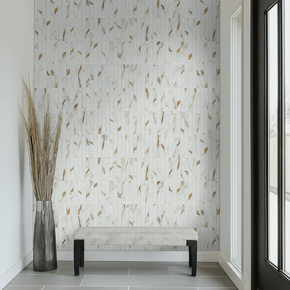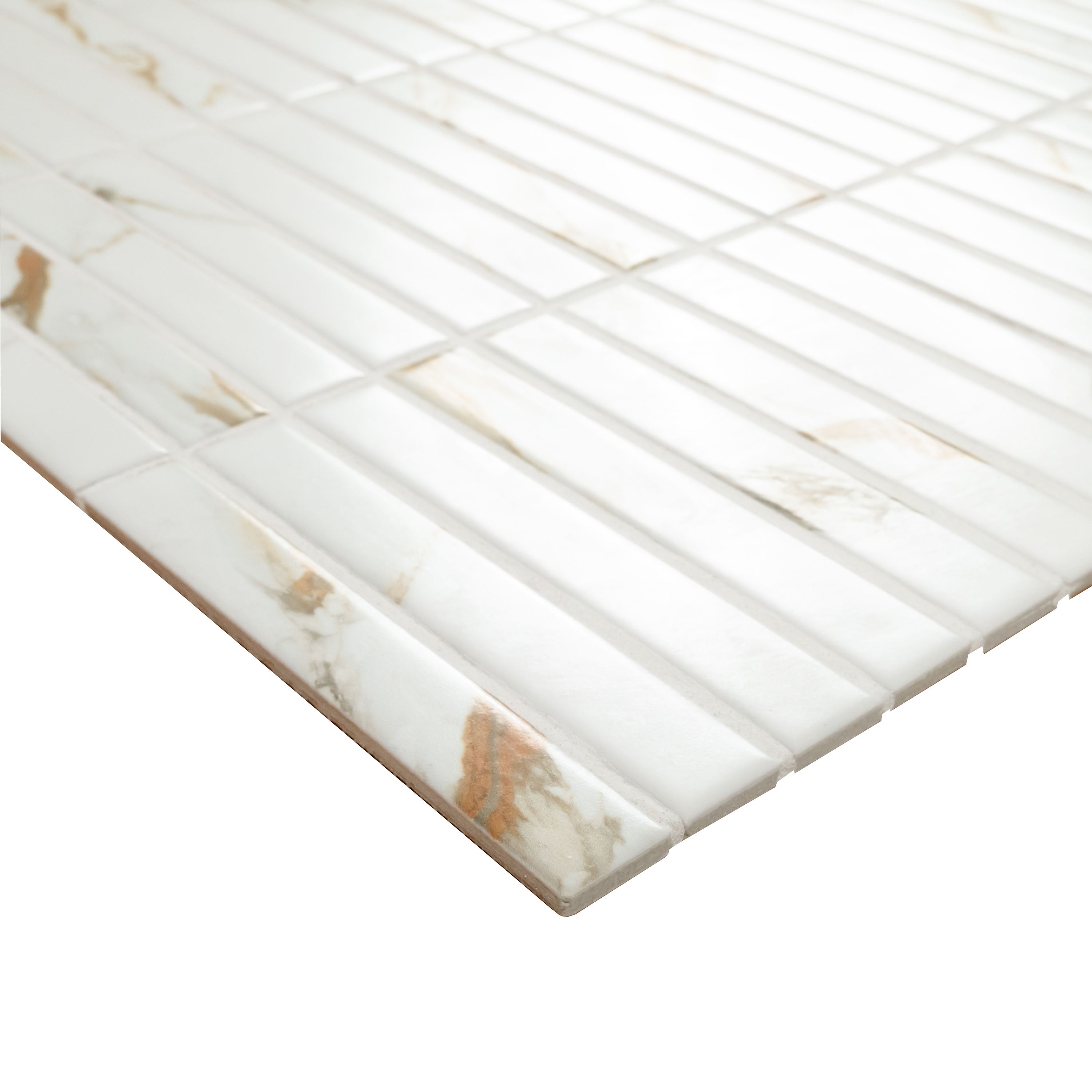 Calacatta Gold Mosaic Tile offers timeless elegance with its warm white background and delicate gold veining. Designed in a 1” x 6” stack pattern, this porcelain tile features a matte finish that adds subtle sophistication to any space. The mesh backing ensures easy installation, making it an ideal choice for accent walls, backsplashes, or even residential floors. Durable and stylish, it’s the perfect solution for elevating interiors with a touch of luxury.