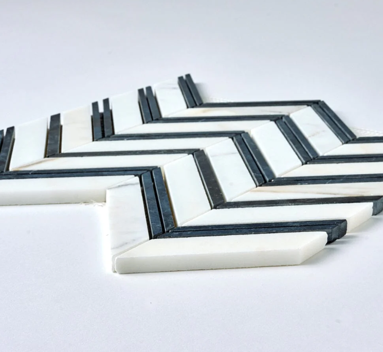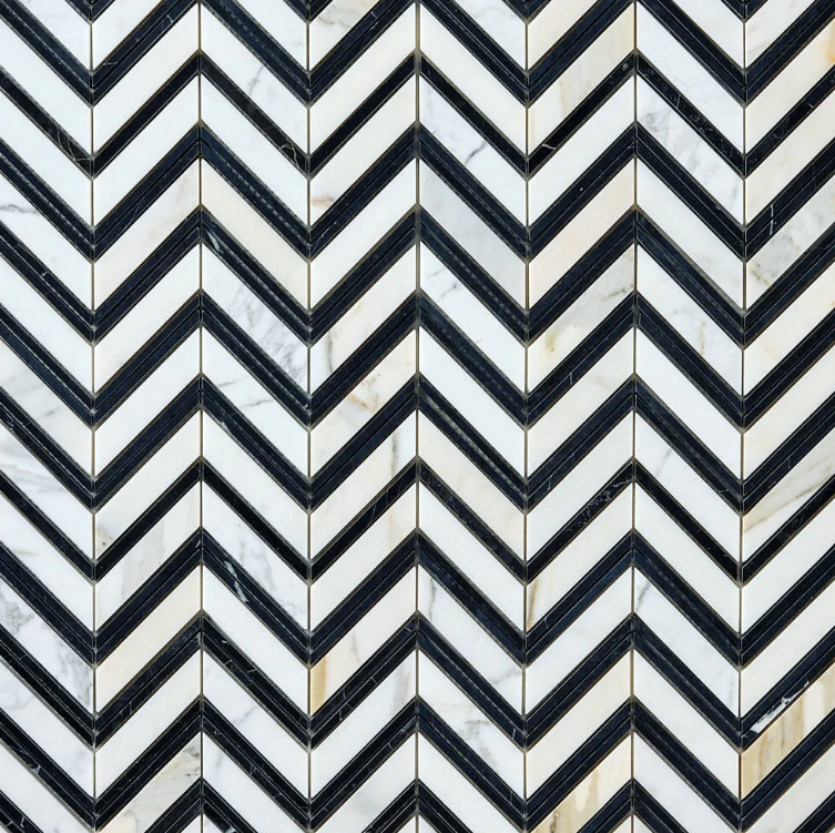 The Calacatta Noir Grand Chevron Marble Mosaic effortlessly combines the luxurious elegance of Calacatta Gold marble with striking black accents in a bold, modern chevron pattern. This stunning mosaic features the signature golden veining of Calacatta marble, complemented by dramatic black tones, creating a dynamic visual contrast. Perfect for high-impact spaces, it works beautifully as a backsplash, feature wall, or floor accent, bringing sophistication and style to kitchens, bathrooms, and beyond. The large-scale chevron pattern adds a sense of movement and modernity, while the rich marble adds timeless luxury.