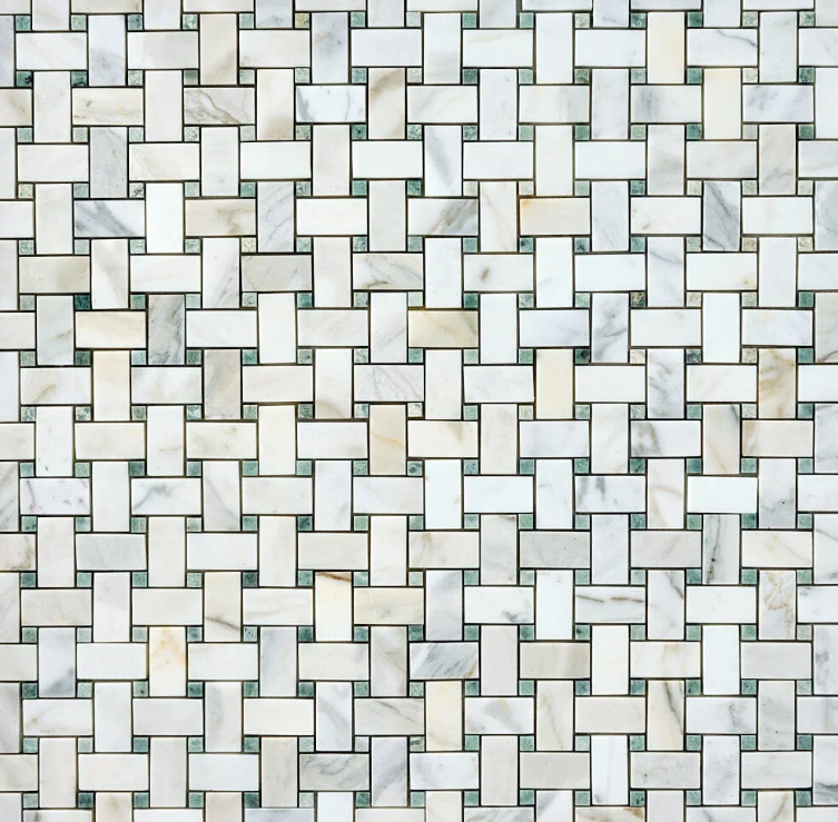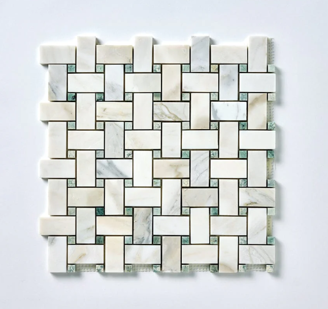 Add a touch of luxury and nature-inspired charm with the Calacatta Verde Basketweave Mosaic. This exquisite design combines the timeless beauty of white Calacatta Gold marble, highlighted with soft golden veining, and vivid green accents to create a fresh and dynamic look. The intricate basketweave pattern adds visual texture and sophistication, making it ideal for kitchens, bathrooms, or feature walls. Whether used as a backsplash, shower floor, or accent piece, this mosaic is a perfect blend of elegance and vibrancy, fitting seamlessly into modern and transitional spaces alike.