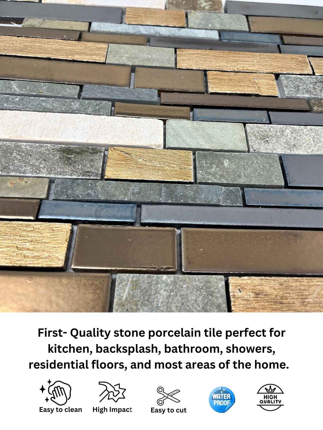 Features strips of natural stone and porcelain Perfect for a kitchen backsplash, bathroom shower, or accent wall...
