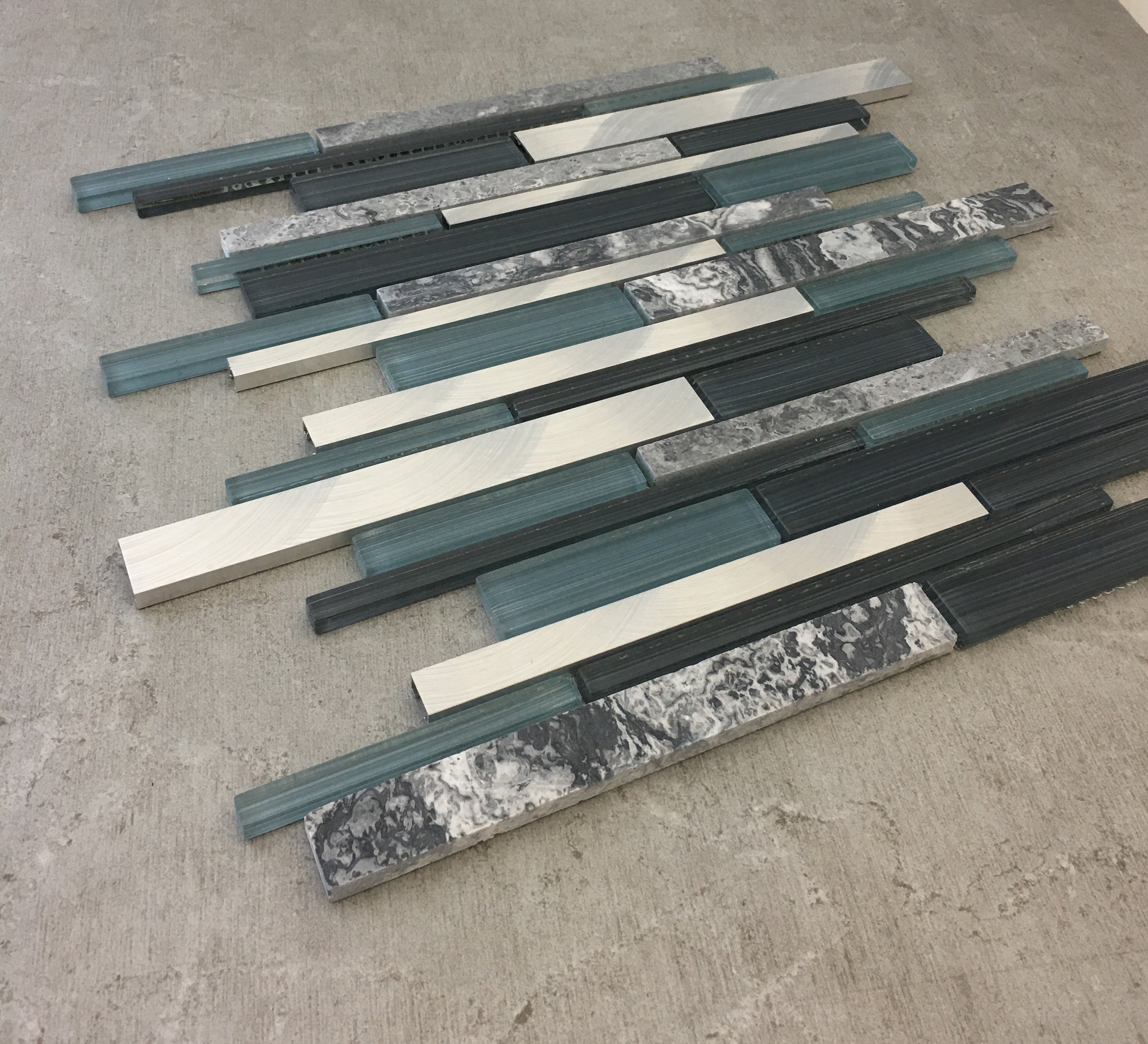 Glossy Blue Glass and Blue Stone Random Brick Straight Pattern Glass Mosaic Tiles