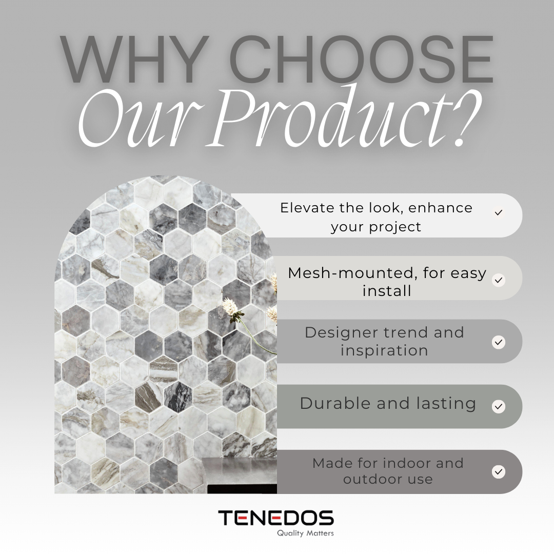 Choose the Hematite Calacatta Hexagon Marble Tile to bring a timeless and stylish aesthetic to your home. With its natural veining, a result of Earth's beauty, this marble serves as a statement piece that will remain fashionable for years to come.