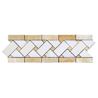 Honey Onyx Thassos White Basketweave Border 3 1/4x12 Honey Onyx with Thassos Basketweave Border Polished Finish great for wall accents and interior use. It can blend well with honey onyx or yellow colored tiles or thassos.