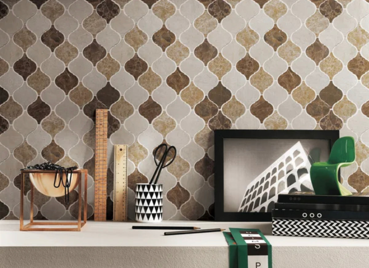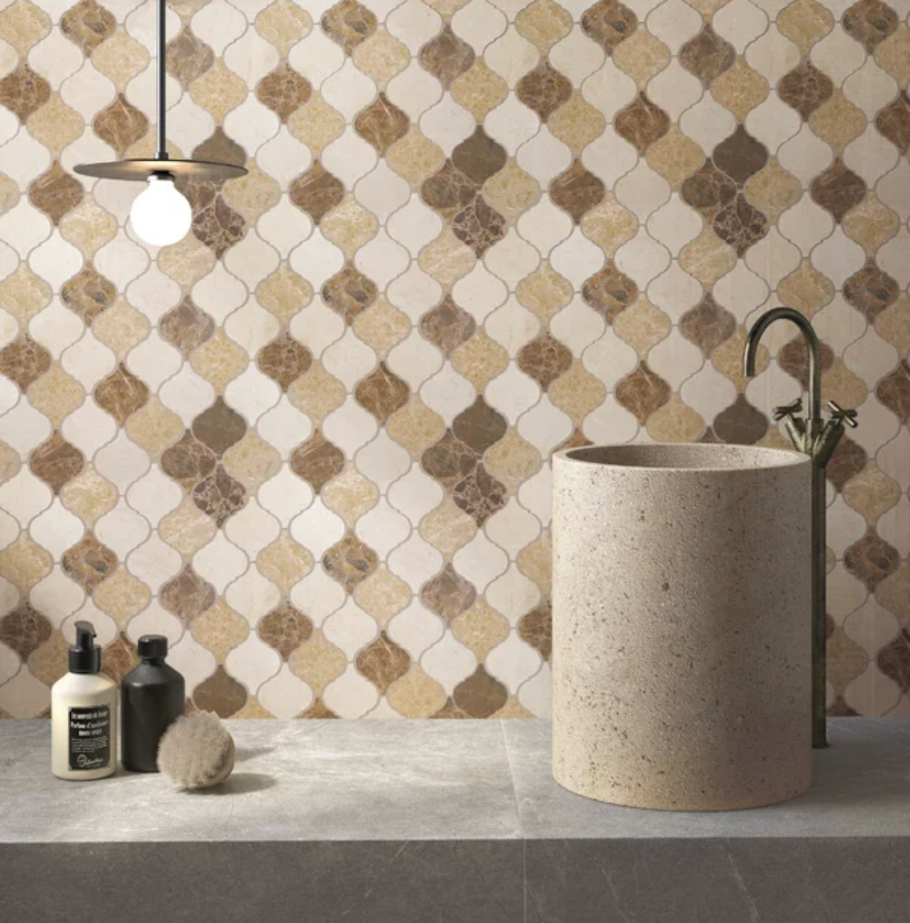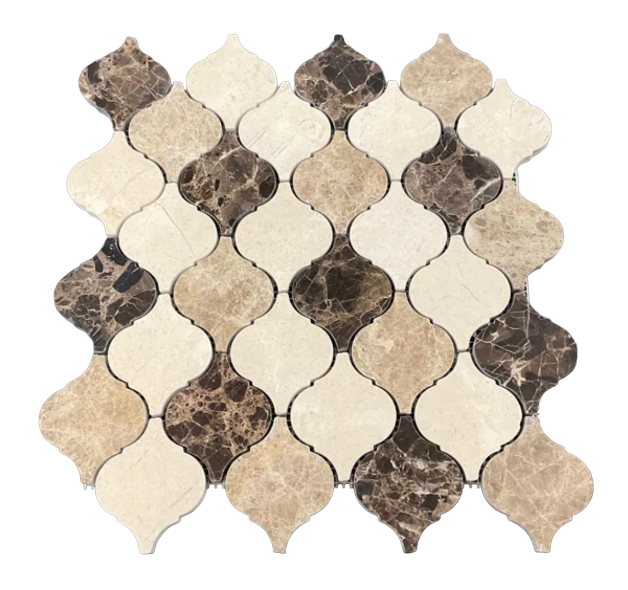 Mix Light and Dark Emperador and Crema Marfil 3 in. Arabesque Lantern Polished Marble Mosaic Floor and Wall Tile for Kitchen Backsplash, Fireplace Surround, Bathroom Wall