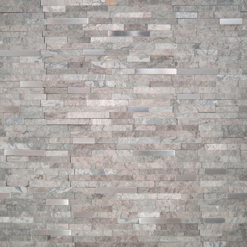 Eclipse Interlocking Mesh-Mounted Mosaic Wall Tile features a blend of gray splitface marble and silver metal strips for space-defining allure in any setting. The 12 in. x 12 in. tiles from MS International boast a medley of varying-length narrow bricks to give any residential or commercial expanse a distinct look and contemporary flair. Trendy gray shades and subtle veins dance amid the natural stone bricks, creating a dramatic impact on walls, fireplace facades and shower/tub surrounds. Hearty enough for outdoor use, these versatile tiles are also a stellar choice for backyard kitchen and bar backsplashes.