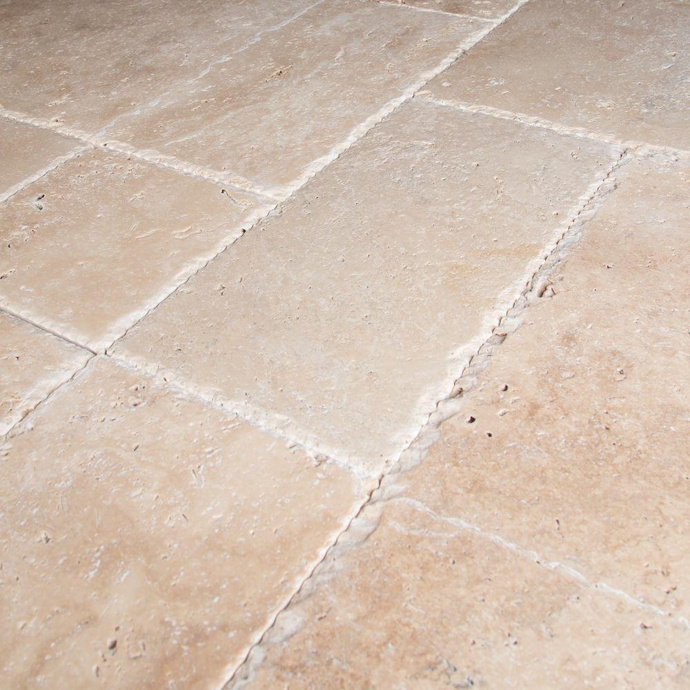 This pallet includes kit (16 sq. ft. ) with rectangular and square tiles that combine to create a Versailles pattern. With a chipped edge, the travertine floor and wall tile provides a rustic, aged look that blends with the surroundings to create an old-world aesthetic.