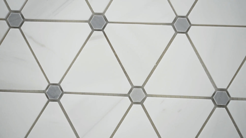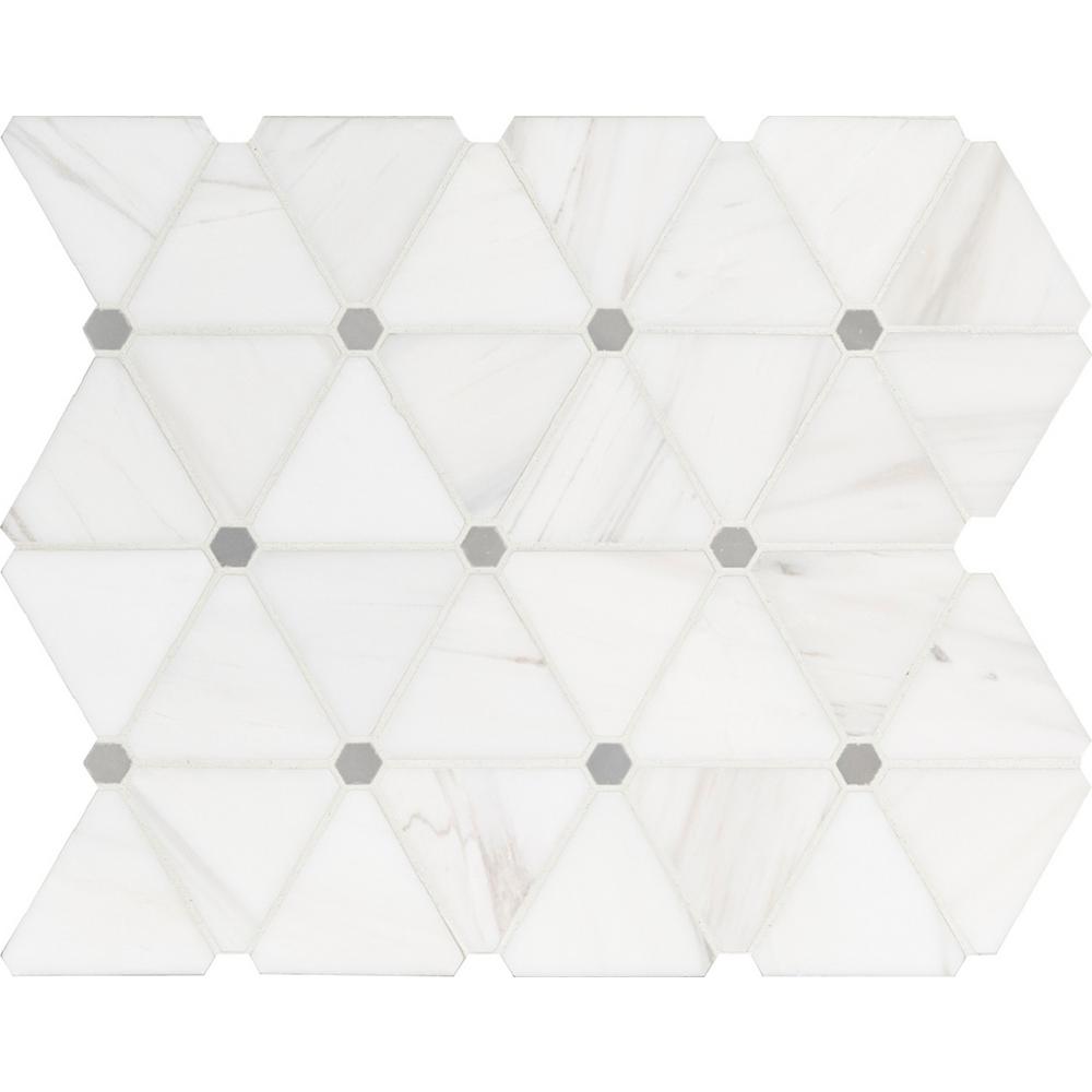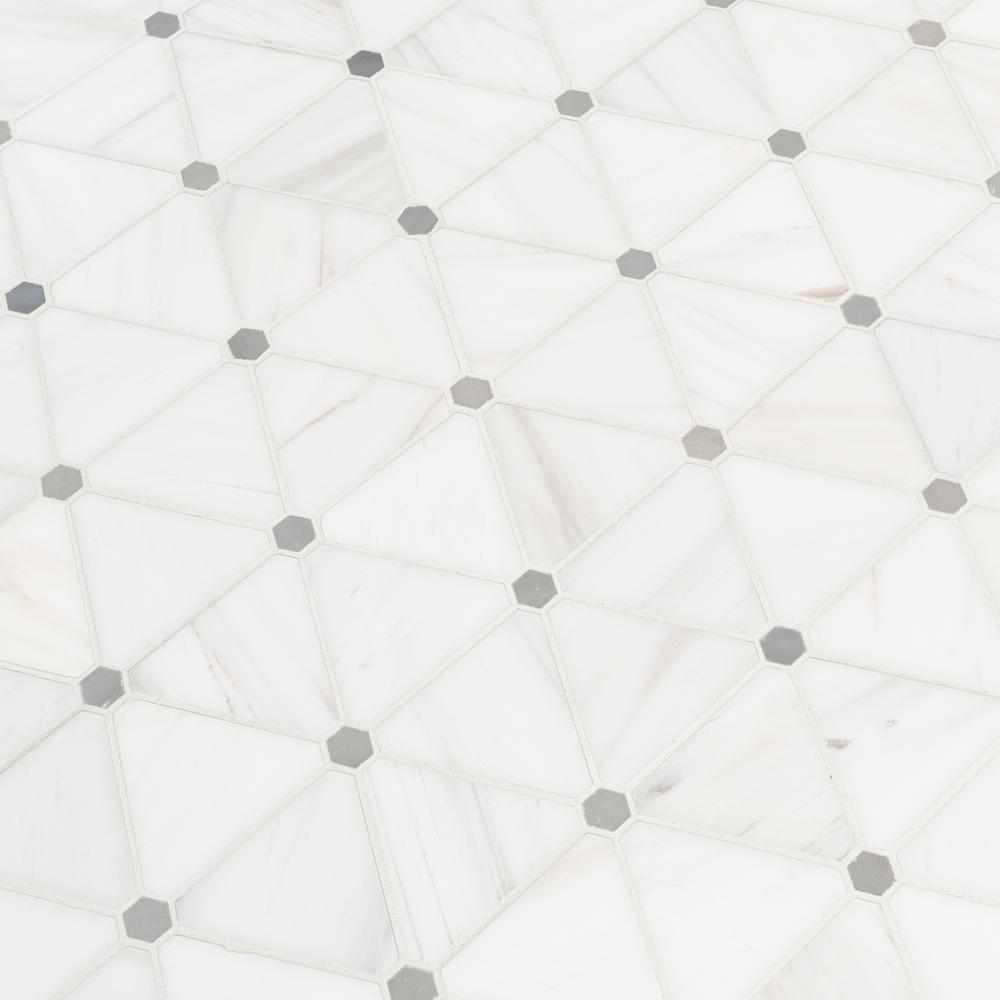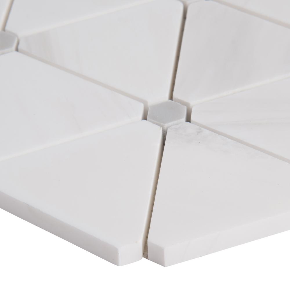 Enhance any space with the MSI Bianco Dolomite Pinwheel Mosaic Tile, crafted from premium natural marble. This elegant tile features a timeless pinwheel pattern with iconic white marble triangles accented by delicate miniature hexagons, blending classic charm with a modern touch. The polished, high-sheen finish and neutral white-gray color palette complement a wide range of design styles and color schemes.