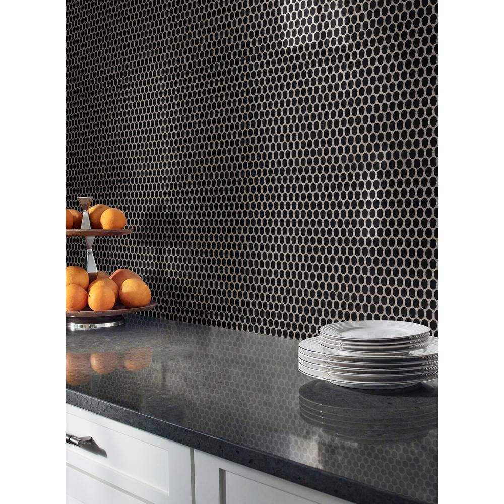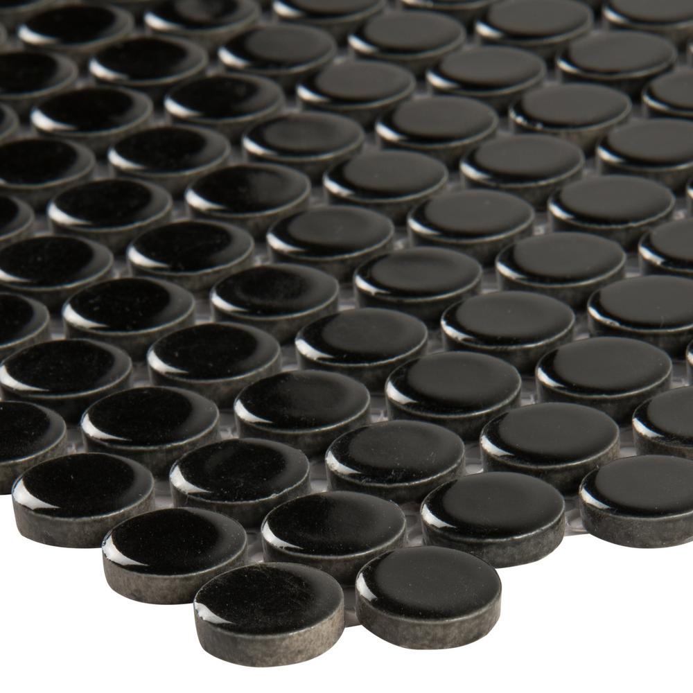 MSIs Black Glossy Penny Round porcelain tile is a nod to retro with a contemporary twist. This charming tile with a glossy finish creates visual interest without overpowering its perfect for updating kitchens and baths. A welcomed addition to both homes and some commercial spaces, use it as wall tile, bathroom or kitchen backsplash tile, or on floors or countertops. When it comes to design versatility, this go-almost-anywhere mosaic is a top pick. Mix and match Black Glossy Penny Round tile with other tiles from MSIs Domino Collection for easy to achieve designer looks. These tiles are mounted on mesh-backed sheets for simplified installation and a professional finish.