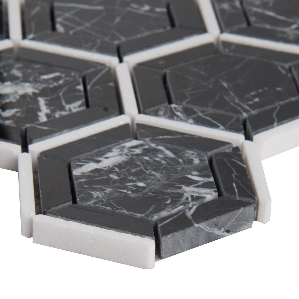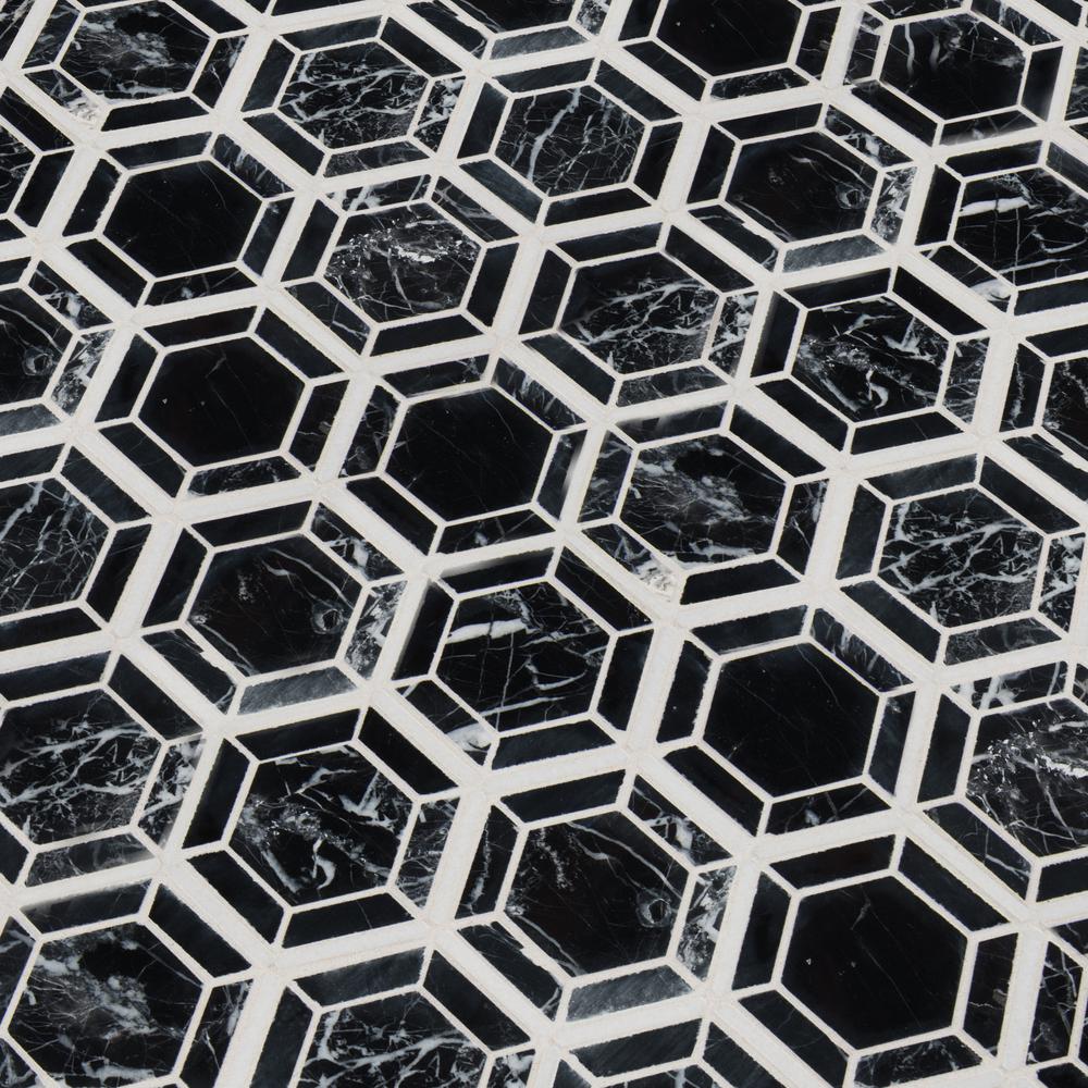 MSls Hexagono Nero Mosaic Tile is crafted from fine natural stone. Featuring a black marble background and layers of interlocking white marble hexagons, its a throw-back to retro with contemporary flair. Bold and beautiful with a sophisticated polished finish, this tile is a conversation-starter. Use Hexagono Nero Mosaic Tile on residential, light commercial, or commercial floors, walls, backsplash, shower surround, or almost anywhere a distinctive pattern is desired. These tiles are GREENGUARD Indoor Air Quality Certified and come mounted on mesh-backed sheets for a simplified installation and professional finish.