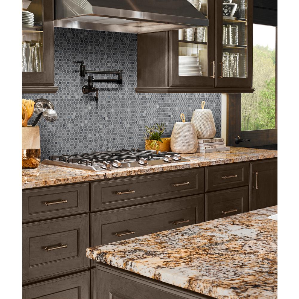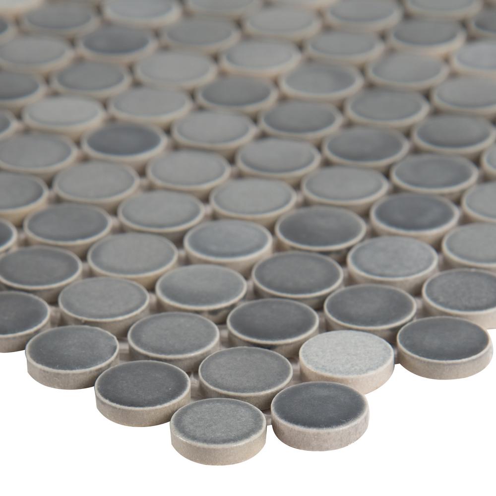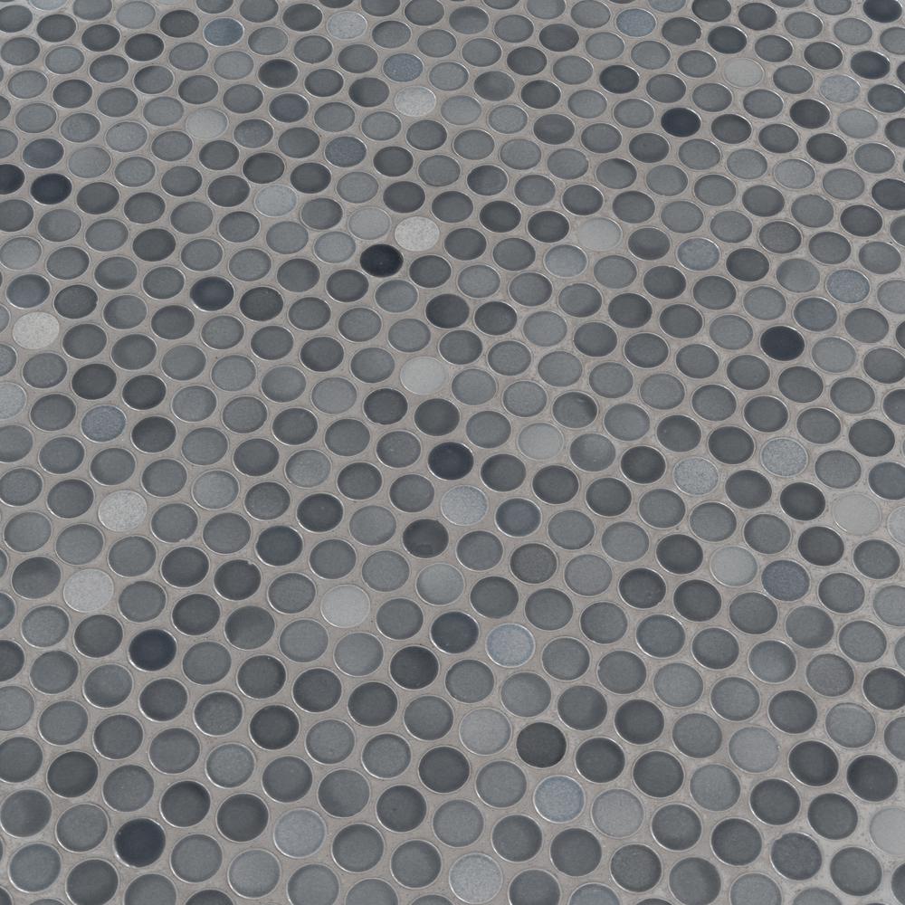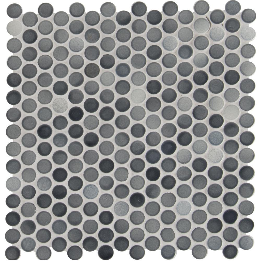 MSI's Grigio Mix Glossy Penny Round Ceramic mosaic tile is a nod to retro with a contemporary twist. This charming tile with a glossy finish and blend of gray, white tones creates visual interest without overpowering its perfect for updating kitchens and baths. A welcomed addition to both homes and some commercial spaces, use it as wall tile, bathroom or kitchen backsplash tile or on floors or countertops. When it comes to design versatility, this go-almost-anywhere mosaic is a top pick. Mix and match Grigio Mix Glossy Penny Round tile with other tiles from MSIs Collection for easy to achieve designer looks. These tiles are mounted on mesh-backed sheets for simplified installation and a professional finish.