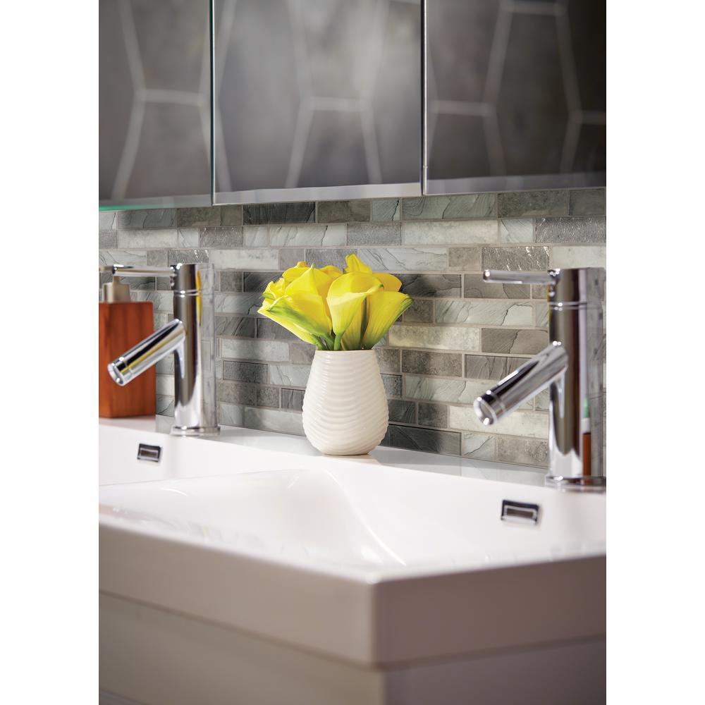 Tiles are mounted on mesh-backed sheets for a simplified installation that yields a professional look.