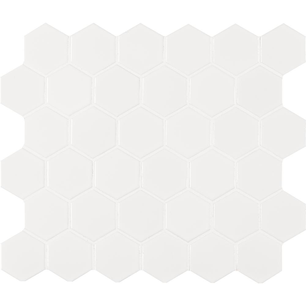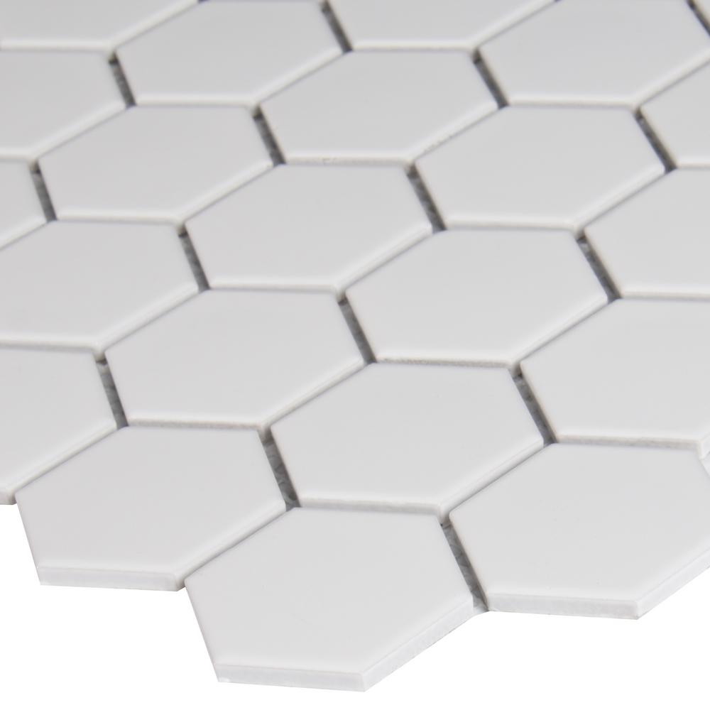 With the White Hexagon Porcelain Mosaic Wall Tile, it's easy to add a splash of contemporary styling to your decor. This attractive tile features a smooth, high sheen finish with 2 in. hexagon arrangement of tile pieces on 10.875 in. x 12.625 in. mesh sheet that makes installation a much easier process. Elegant white shades of this porcelain create a distinct pattern for various install projects in bathrooms, kitchens and other residential or commercial spaces.
