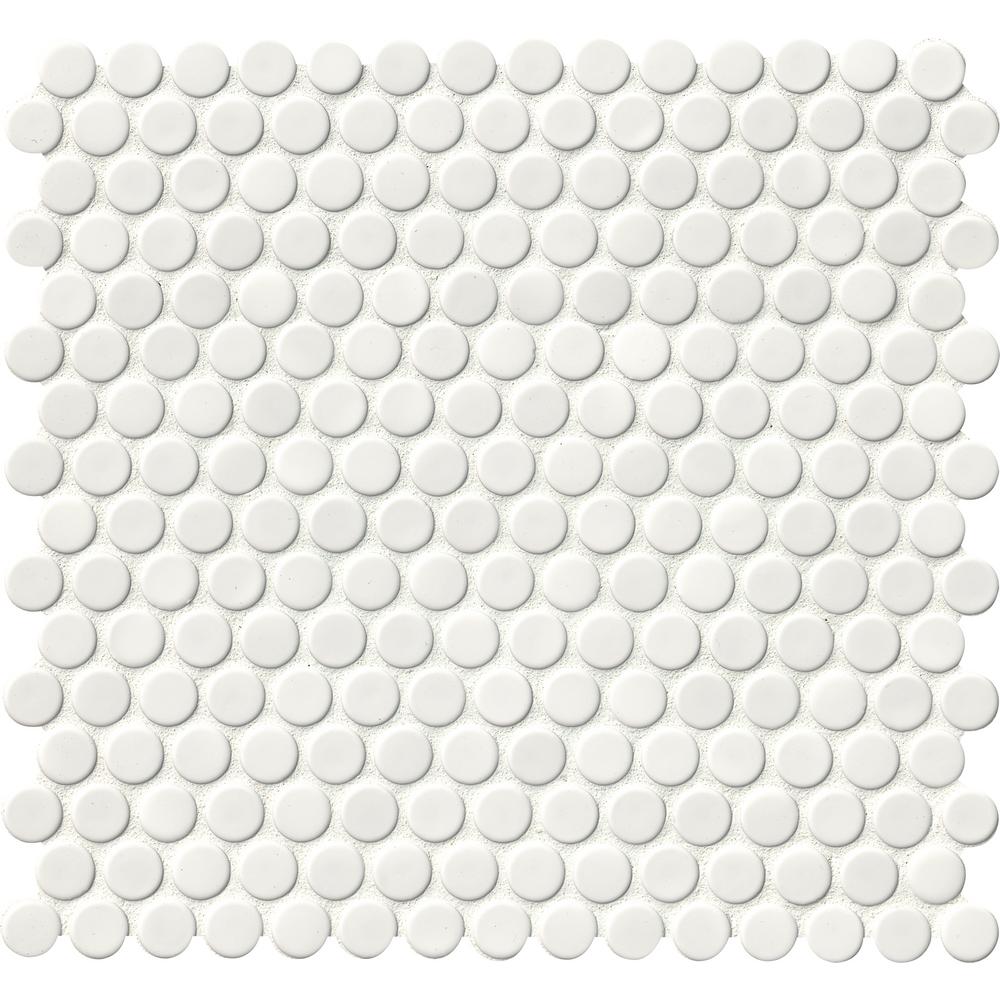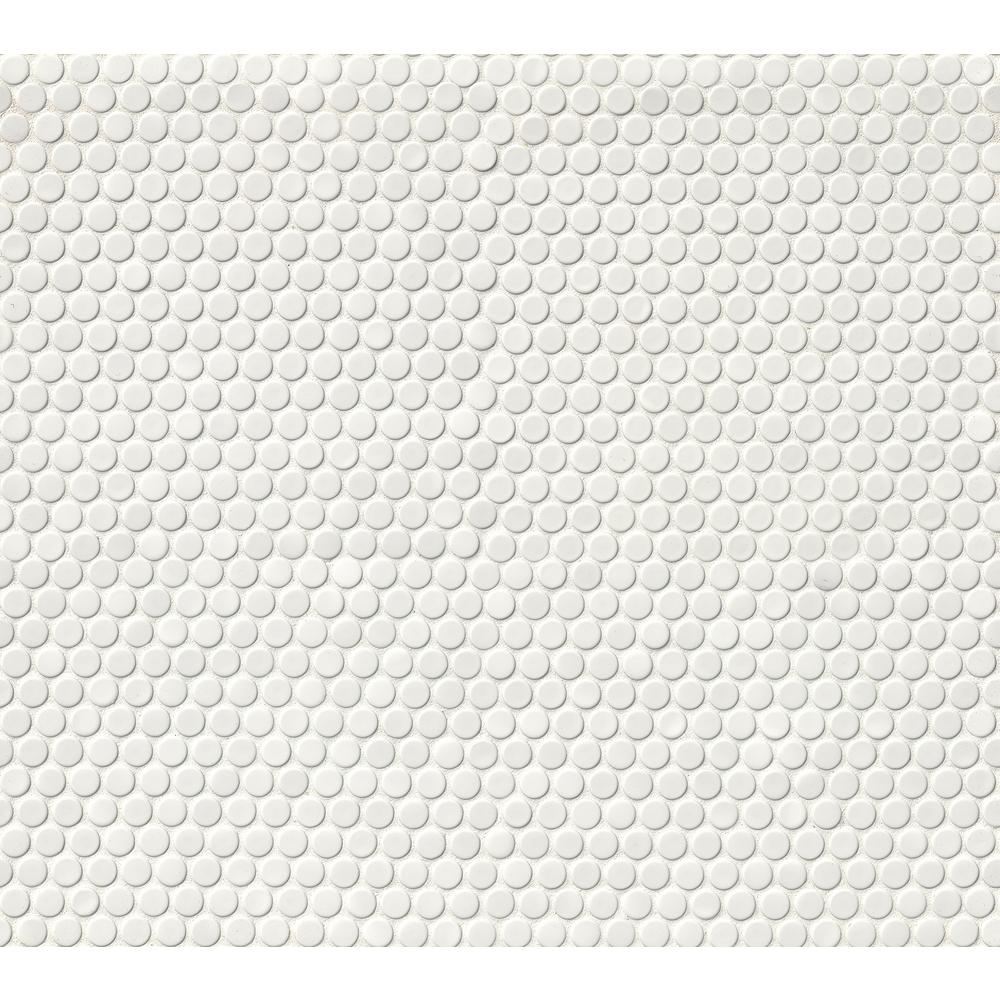 MSI's White Glossy Penny Round Glazed Porcelain Mosaic Tiles are retro with a refreshing modern edge. Their timeless shape and color make them exceedingly versatile - complementing traditional to contemporary design styles. Pair them with large format porcelain tiles from the Domino Collection for a style-savvy cohesive look or use them alone to add detail and interest to residential floors, walls, counters or backsplashes. The choice is yours and the possibilities are endless. Incredibly durable and easy to care for, this low sheen tile is also recommended for some light commercial and heavy commercial applications, including walls and backsplash. Tiles are prearranged on mesh-backed sheets for simplified installation.