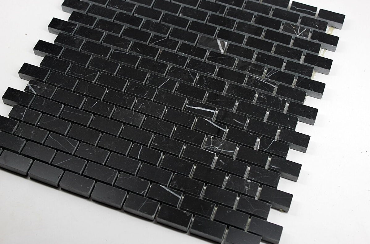 Blackstone Nero Marquina Mini Brick polished marble mosaic tile from Stone Tile Mosaics helps achieve a contemporary or classic look when incorporated with our Carrara marble tile collections. Our Nero Marquina marble tiles, mosaics and trims in different sizes will meet any design challenge. These mosaics and tiles are great when used in conjunction with White Carrara marble collections or it can simply be used as a standalone design for walls, backsplashes, countertops and residential floors.