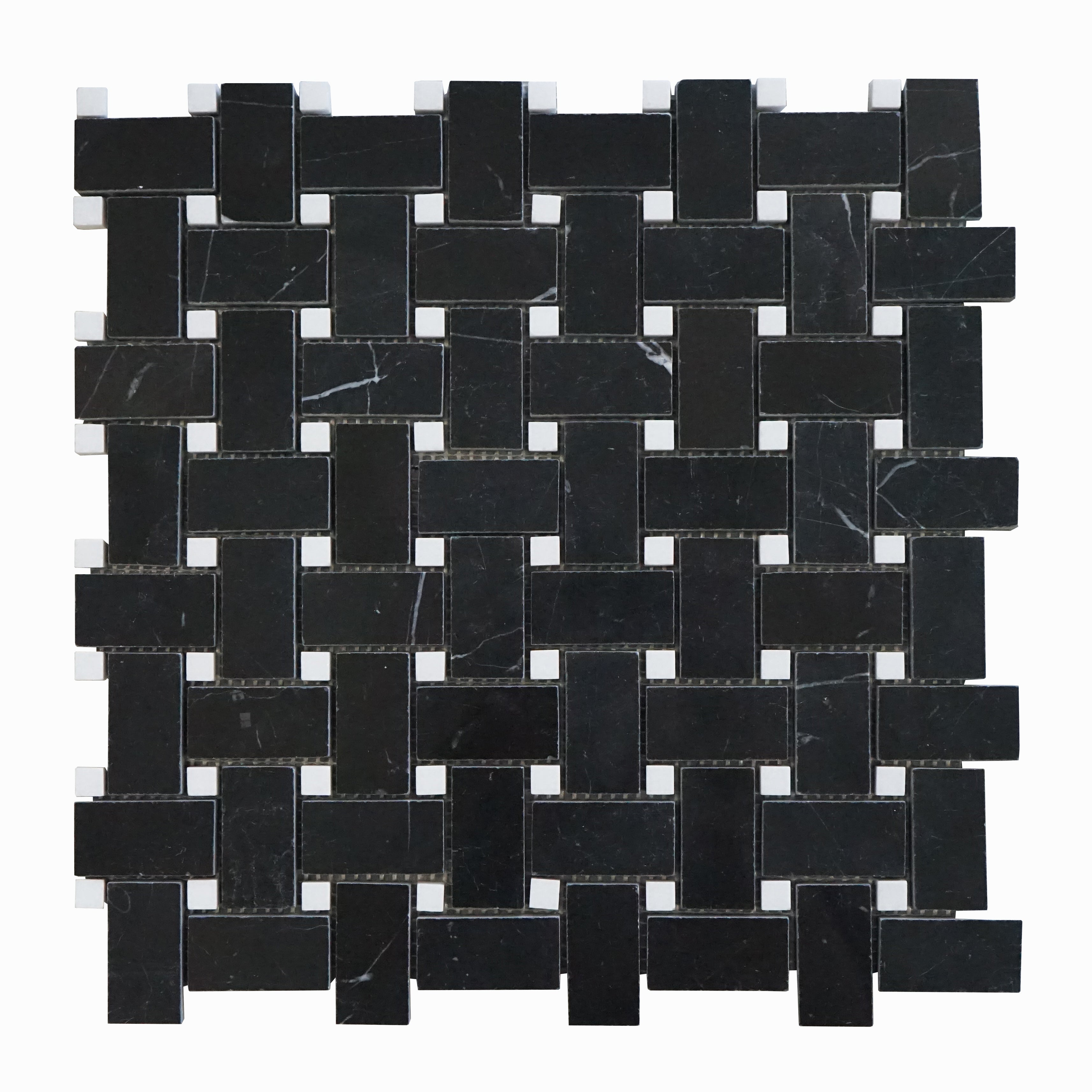 Tenedos Black Marble 1x2 Basketweave Mosaic Tile w/White Marble Dots Polished for Kitchen Backsplash Bathroom Flooring