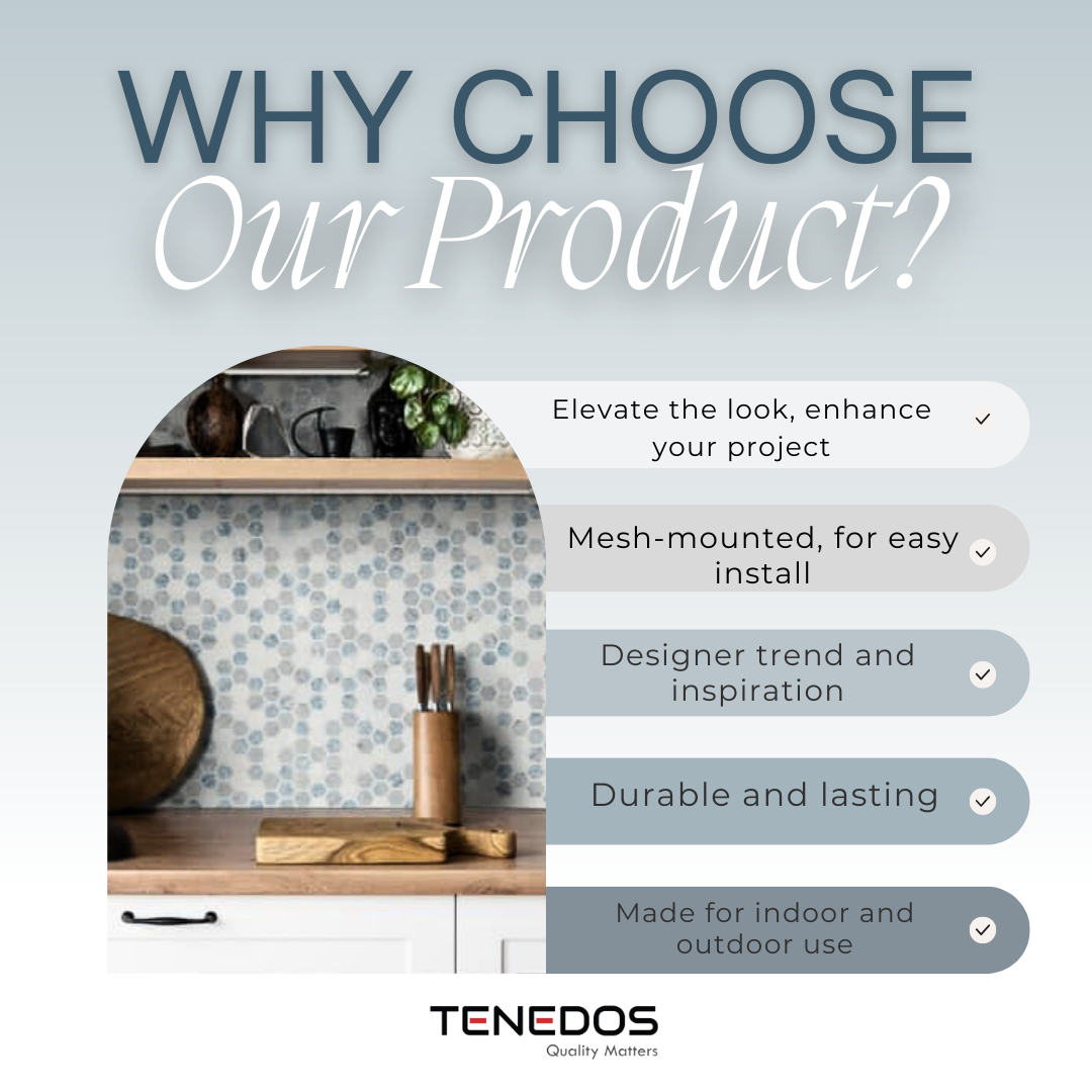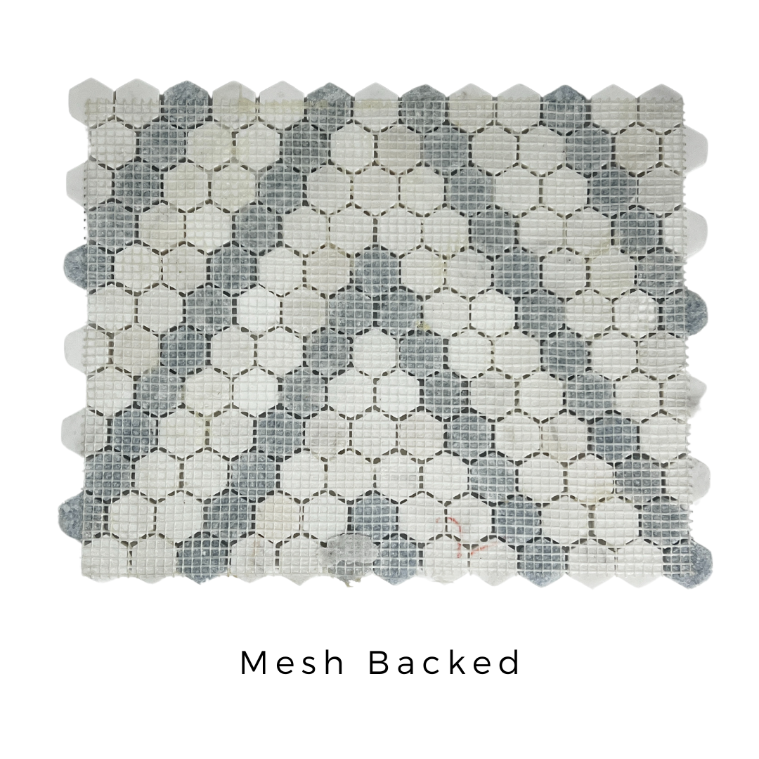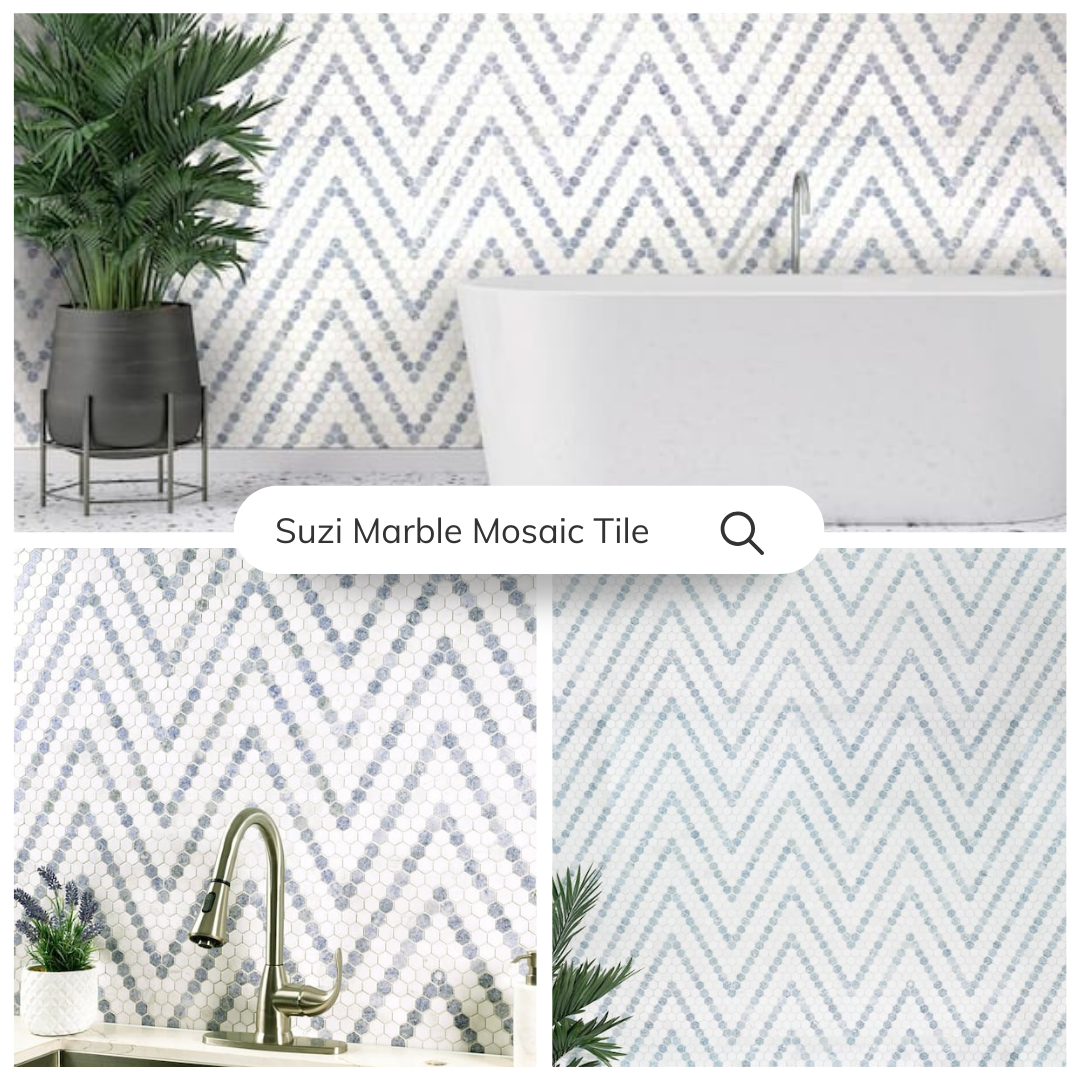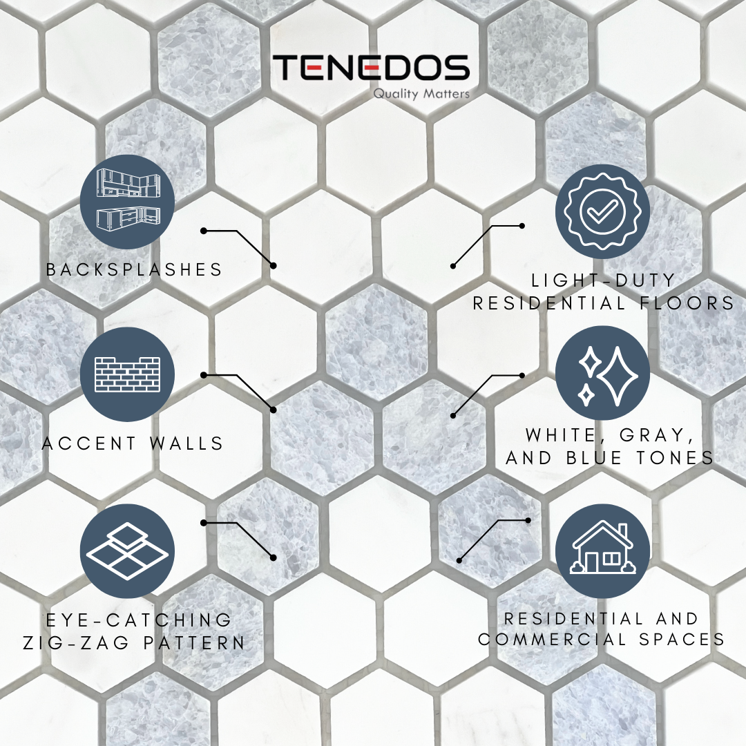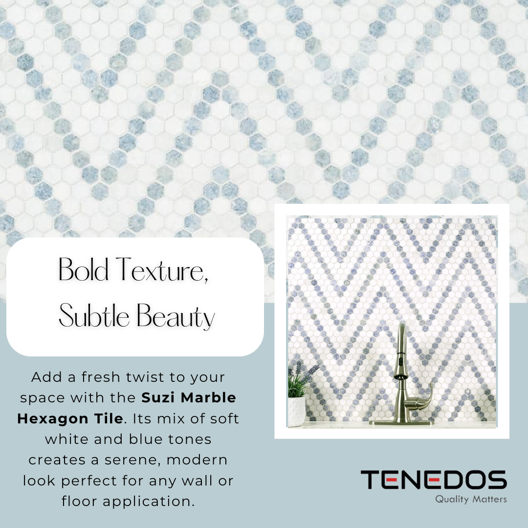 Introducing the stunning Suzi Marble Hexagon Tile, a remarkable display of 1-inch hexagon marble tiles, artfully arranged in a striking zig-zag pattern with an elegant blend of white, gray, and blue hues. Finished with a polished sheen, these tiles bring sophistication to any space. The tiles are conveniently mesh-backed, making them ideal for accent walls, backsplashes, or even residential floors. Discover the beauty and refinement of these exceptional mosaic tiles.