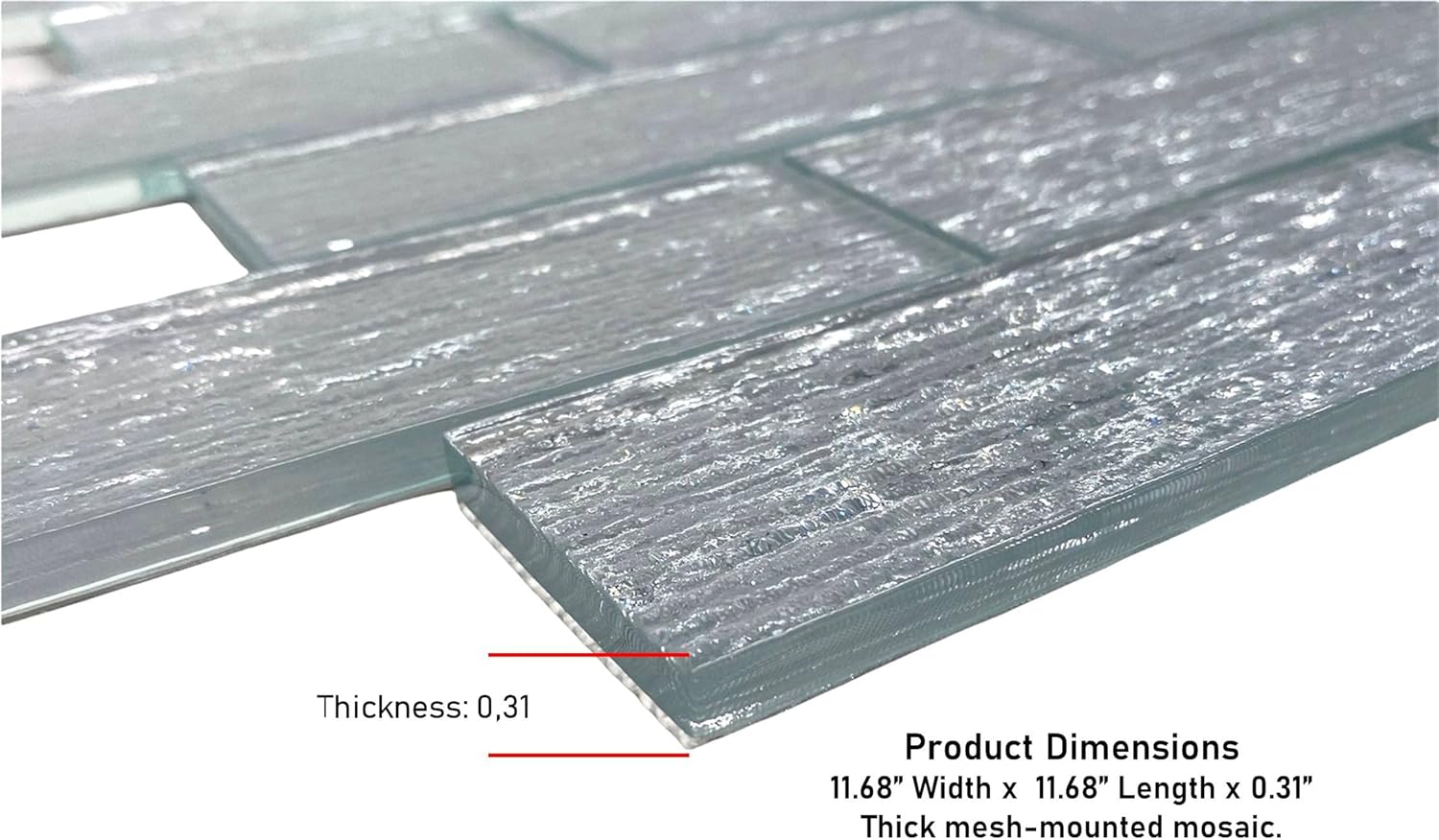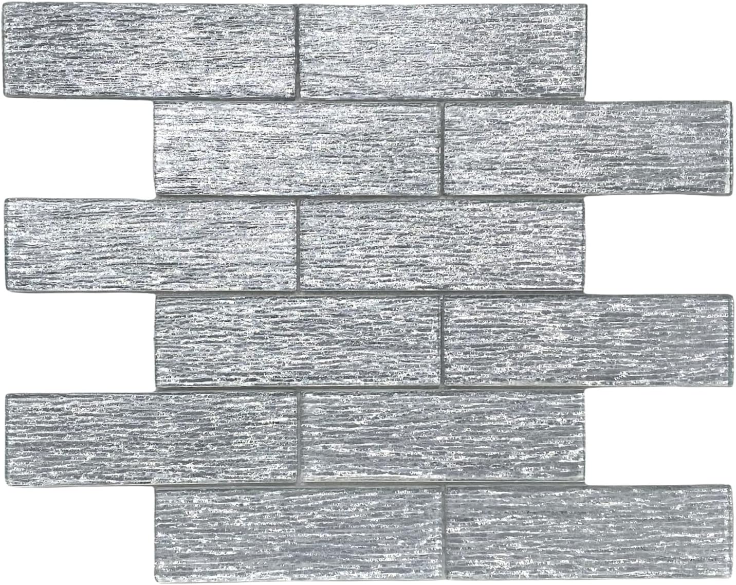 Enhance your interior design with the luxurious elegance of the Glitter Silver Decorative Glass Accent Panel – 2x6 Textured Brick Design – 1 Sheet. Each mesh-mounted sheet measures 11.68" x 11.68", covering approximately 1 square foot, making it perfect for small projects, accent areas, or sample purchases. The brick pattern features individual 1.875" x 5.75" glossy glass bricks that reflect light beautifully, creating a sparkling and modern visual effect. Crafted from high-quality glass, this accent panel offers outstanding durability, water resistance, and easy maintenance, ensuring its stunning appearance lasts for years. The glossy finish adds depth and brilliance, while the silver and gray tones provide a sophisticated and contemporary aesthetic that complements a wide variety of design styles. Its simple glue-down installation makes it ideal for both DIY enthusiasts and professional installers. Whether used on kitchen islands, backsplashes, bathroom walls, bedroom accent walls, laundry rooms, or other decorative spaces, the Glitter Silver Decorative Glass Accent Panel brings a touch of luxury and timeless beauty to any interior. The unique glitter texture adds a shimmering effect that transforms ordinary walls into elegant, eye-catching focal points perfect for both modern residential and upscale commercial environments.