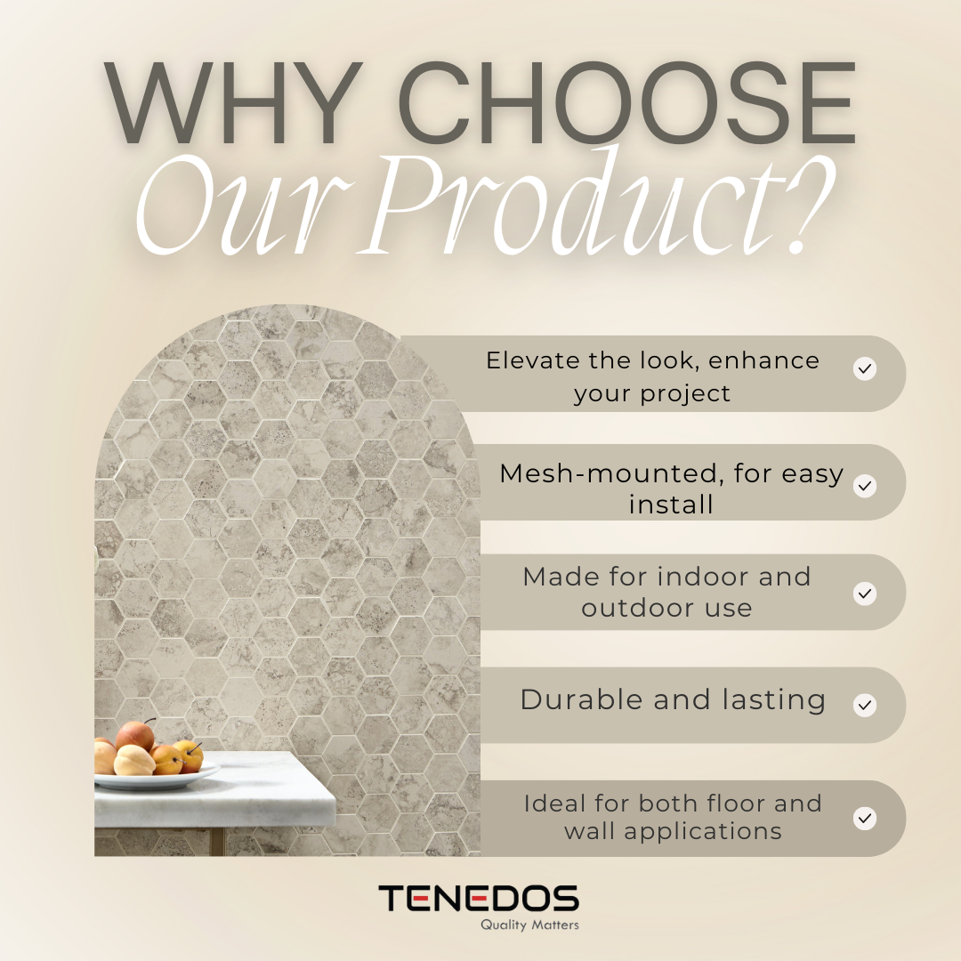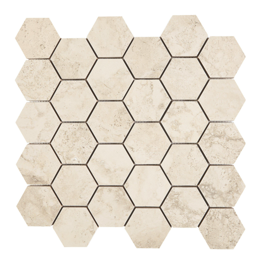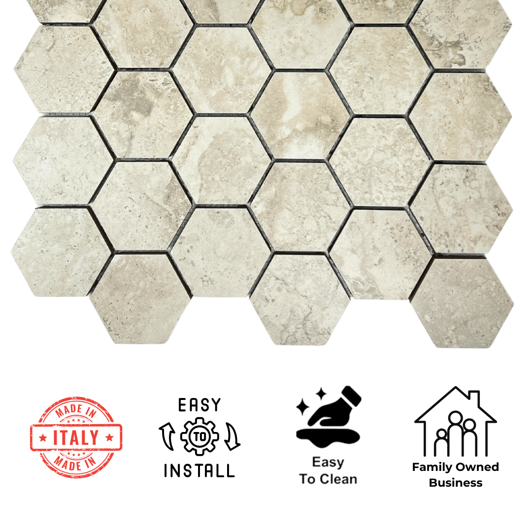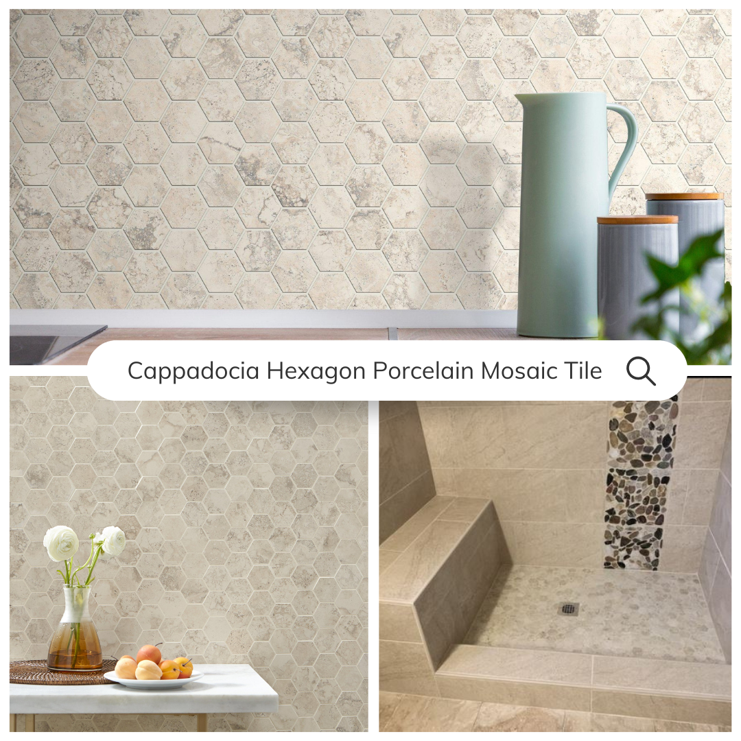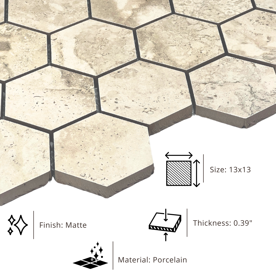 Transform your space with the Tenedos HT169 Cappadocia Hexagon Porcelain Mosaic Tile in a beautiful beige hue with a matte finish. This 13 x 13 tile combines the classic elegance of natural stone with the resilience and easy maintenance of porcelain. Ideal for both residential and commercial settings, its fade-resistant and waterproof properties make it suitable for bathrooms, kitchens, shower floors and walls, pool interiors, and fireplace surrounds. With a high PEI Rating of 4 and DCOF of >= 0.42, this tile offers excellent durability and slip resistance, perfect for high-traffic areas. Made in Turkey, this tile brings a touch of refined sophistication to any indoor design.
