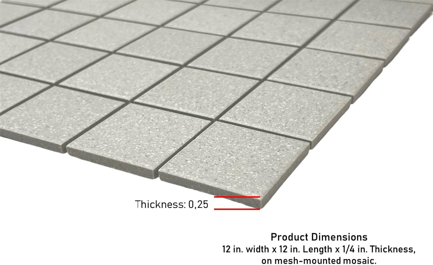 -12 in. length x 12 in. wide x 1/4 in. thick -Unglazed smooth finish with a low sheen and uniform appearance in tone.
