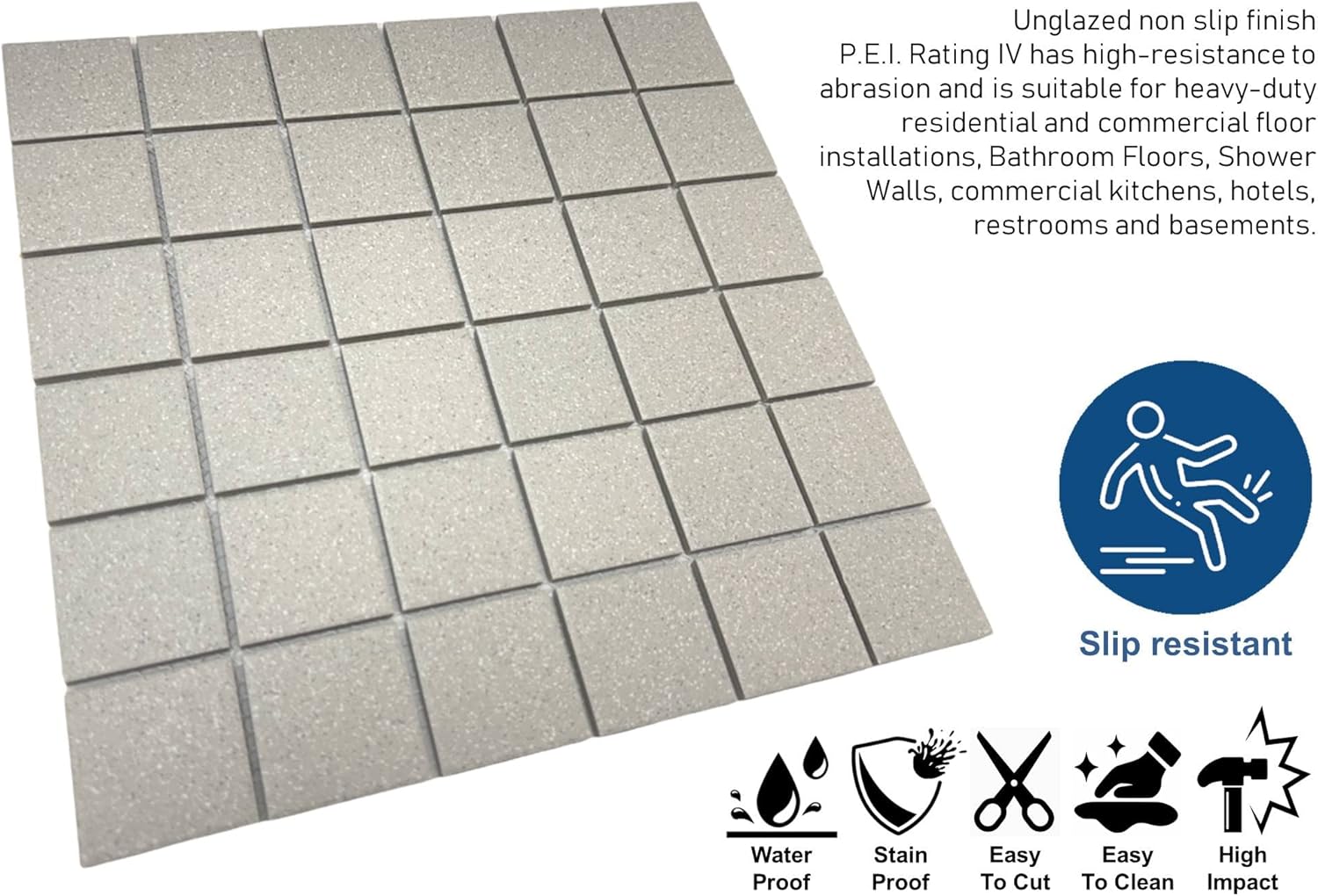 Unglazed Grey Speckled porcelain mosaic is a porcelain tile, suitable for areas exposed to potentially slippery conditions such as shower floors, entrances, bathroom floors and countertop surfaces. Both practical and elegant.