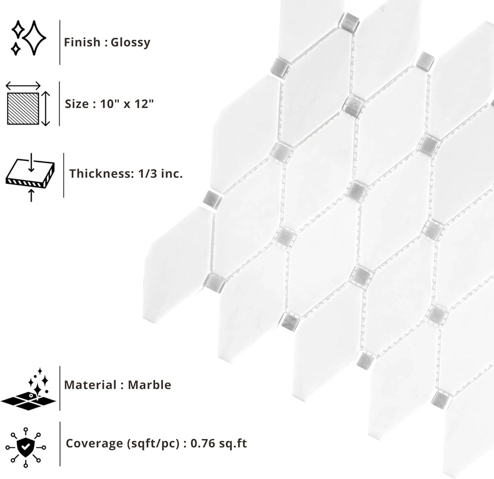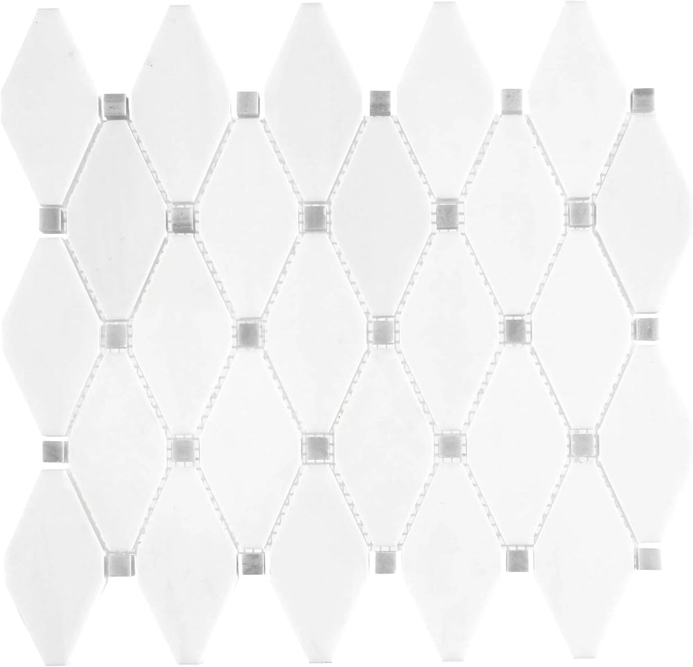 Tenedos White Dolomite Diamond Marble Mosaic Tile is an exceptional choice for designers and homeowners seeking a modern and refined aesthetic. The pure white tones and clean veining of natural Dolomite stone bring brightness and sophistication to any space. The diamond-shaped mosaic pieces create a dynamic geometric pattern that adds visual depth and a striking architectural detail to both walls and floors. The polished finish reflects light beautifully, enhancing the sense of openness while delivering a premium, high-end look. Each 10x12-inch sheet is precisely manufactured for easy alignment and smooth installation. Suitable for indoor applications, this mosaic is ideal for bathrooms, showers, kitchen backsplashes, entryways, and fireplace surrounds. The inherent durability of Dolomite stone offers excellent resistance to moisture and heat, and when properly sealed, maintains its original appearance for many years. Perfect for both contemporary and classic interiors, this mosaic adds timeless elegance to any project.