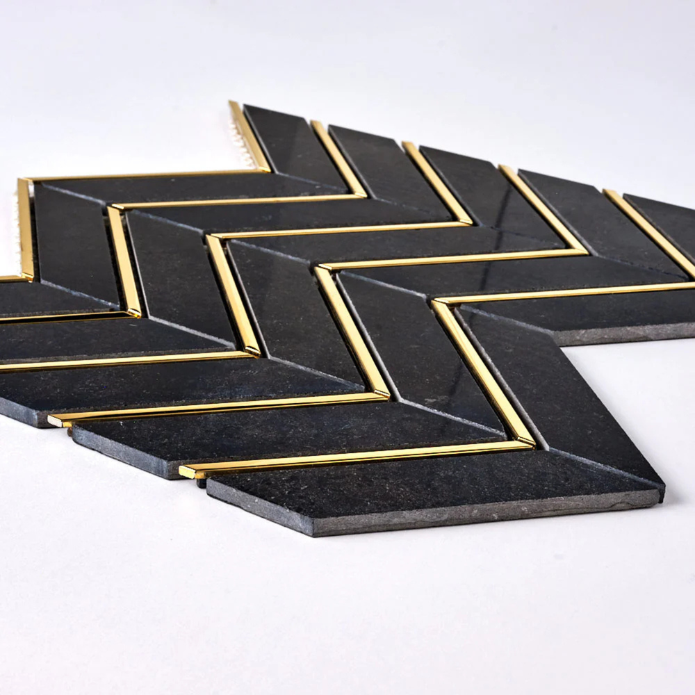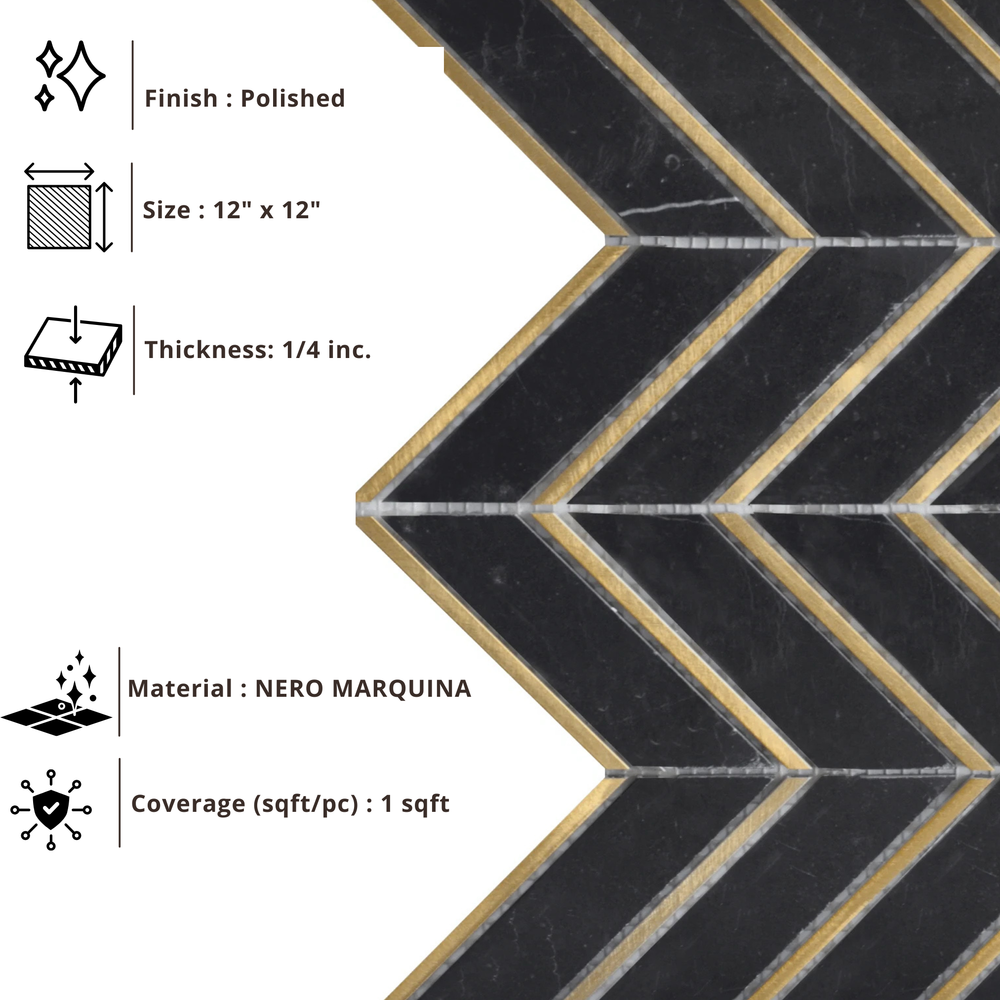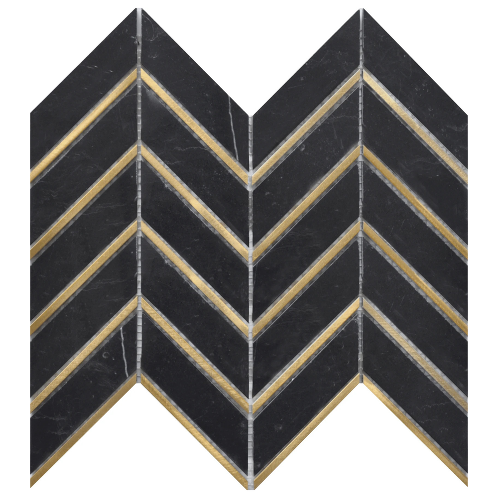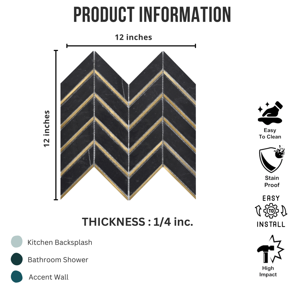 Tenedos HTCRC 12x12 Inch Nero Arrow Metal Mosaic Tile brings bold luxury and modern style to your interior walls with a striking black marble look and elegant gold metal inlay. Designed in a chevron/arrow (V-shape) pattern, this mosaic adds depth, movement, and a high-end architectural feel to any space. The rich Nero Marquina-inspired background creates dramatic contrast, while the gold accent lines deliver a refined, upscale finish that pairs beautifully with brass fixtures, matte black hardware, and contemporary cabinetry. Perfect for wall applications such as kitchen backsplashes, bathroom walls, shower walls, vanity surrounds, and statement accent walls, this tile instantly elevates your design with a sophisticated focal point. Each sheet is mesh-mounted for easier handling, clean alignment, and a smooth installation process. Available in two purchase options to fit your project needs: 1 sheet for samples or small areas, or 11 sheets covering 9.33 sq ft for larger installations. Ideal for homeowners, designers, and contractors seeking a premium decorative mosaic with modern metallic detail.