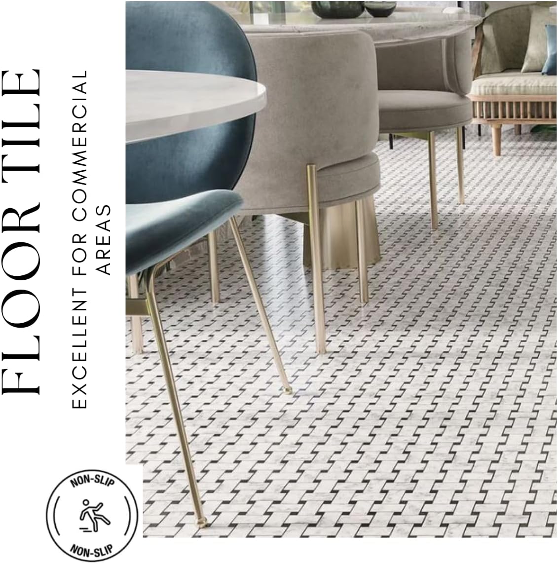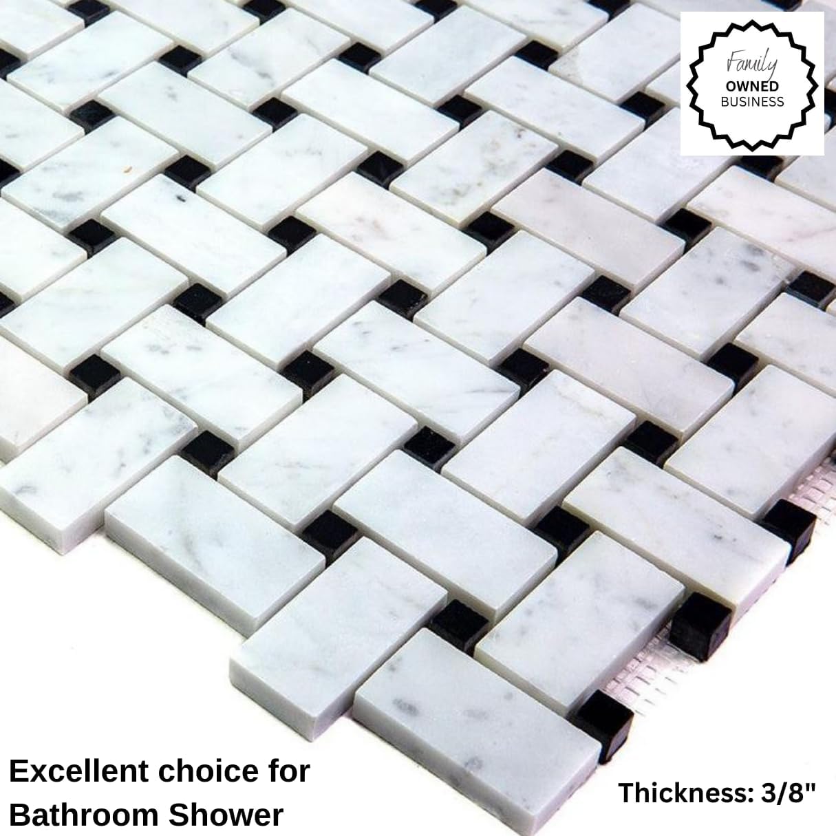 The basketweave pattern of these tiles offers a unique and visually interesting design that adds texture and visual depth to floors and walls. The interlocking rectangles create a sense of movement and flow, while the black dots add contrast and accentuate the geometric pattern, resulting in a striking and sophisticated look.