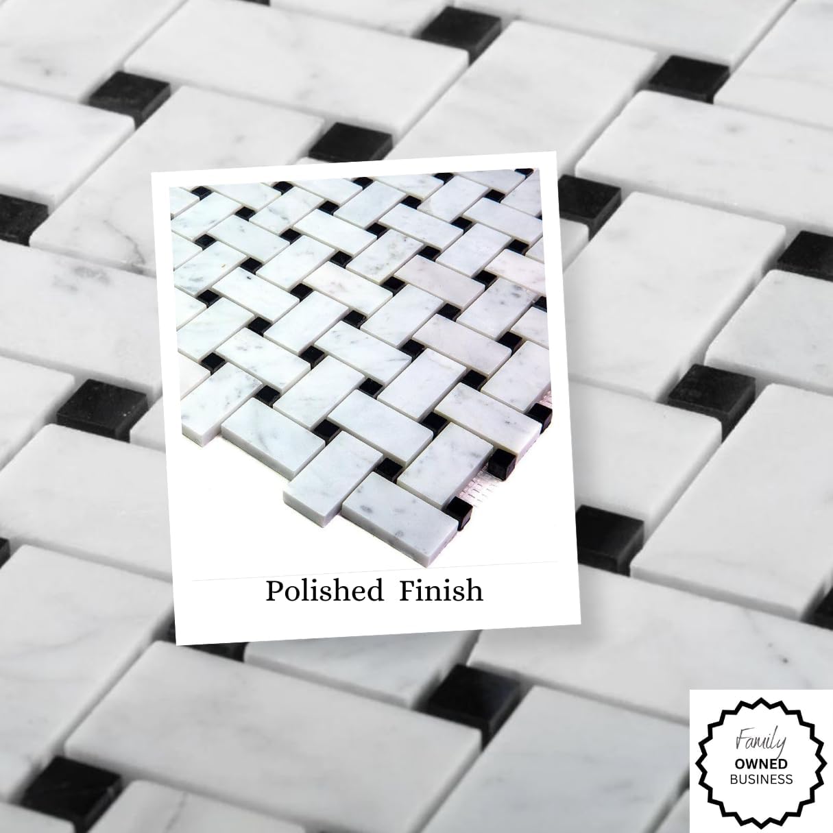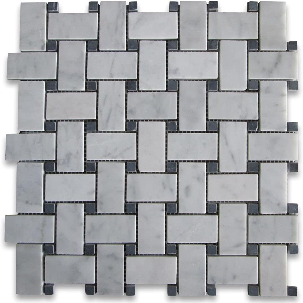Carrara marble basketweave with black dots polished floor and wall tiles are a stunning choice for adding elegance and sophistication to interior spaces. This particular tile design combines the classic beauty of Carrara marble with a timeless basketweave pattern accented by small black dots, creating a visually captivating and luxurious aesthetic.
