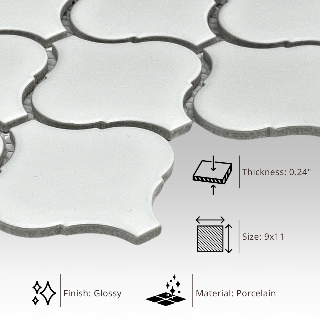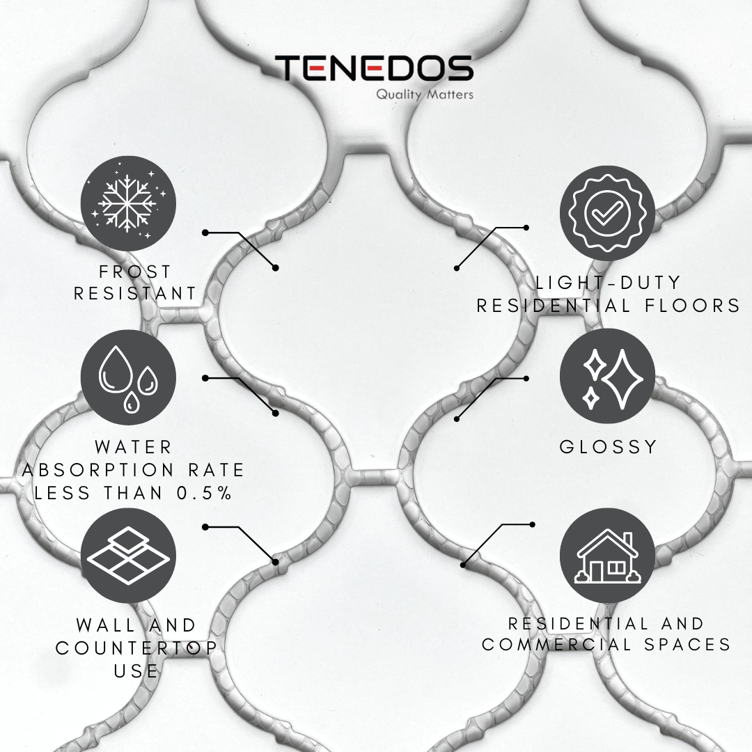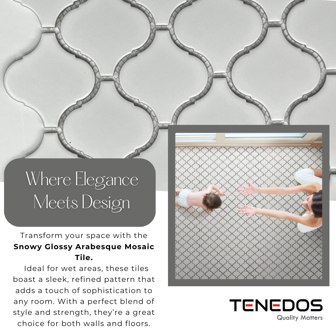 Enhance your home or business with these Tenedos Snowy Glossy Arabesque Porcelain Patterned Look Wall Tile, adding a touch of sophistication to any setting. These glossy, mesh-backed mosaic tiles interlock seamlessly for a smooth, transition-free look. The elegant white arabesque-style pattern is perfect for both indoor and outdoor spaces, lending a chic, timeless appeal.