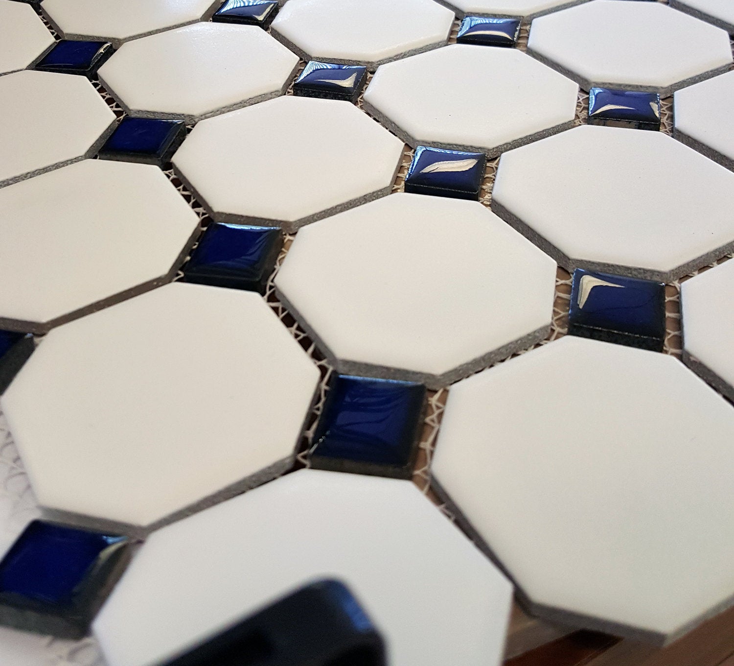 Each octagon tile measures 2-3/16", offering a classic look that never goes out of style. Elevate your space with the timeless beauty and versatility of the Octagon Porcelain Mosaic Wall Floor Tile Matte White with Glossy Cobalt Blue Dots, designed to enhance any environment with its understated elegance and enduring appeal.