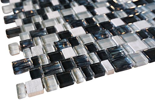 White, Black and Blue Random Brick Cubes Pattern Glass Mosaic Tiles on a mesh netting.